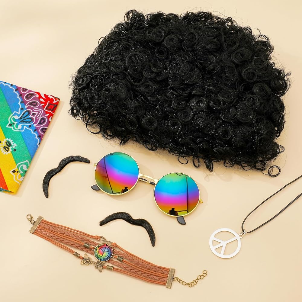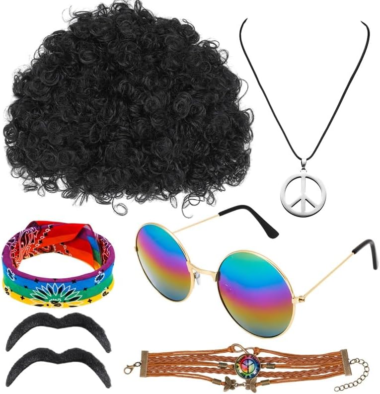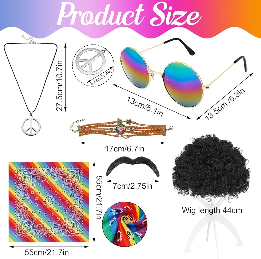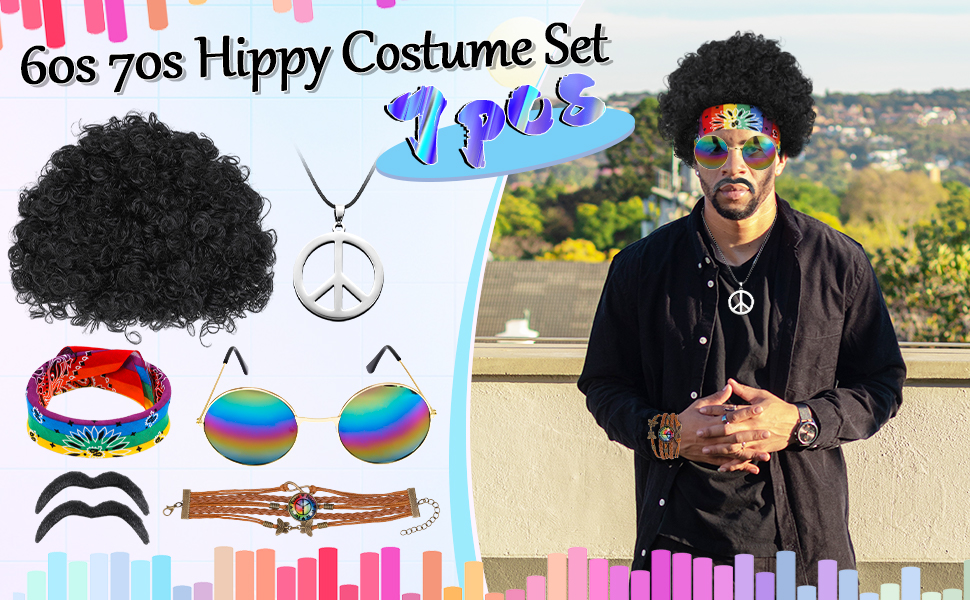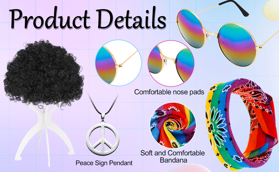 • حزمة قيمة: سوف تحصل على 7 قطع من إكسسوارات أزياء هيبي بما في ذلك الشعر المستعار الأفريقي غير التقليدي، وقلادة علامة السلام، والسوار، والنظارات الشمسية هيبي، و2 × شارب وعصابة رأس مصبوغة بألوان قوس قزح. سوف يجعلك محط التركيز في الحفلة ذات الطابع الخاص.