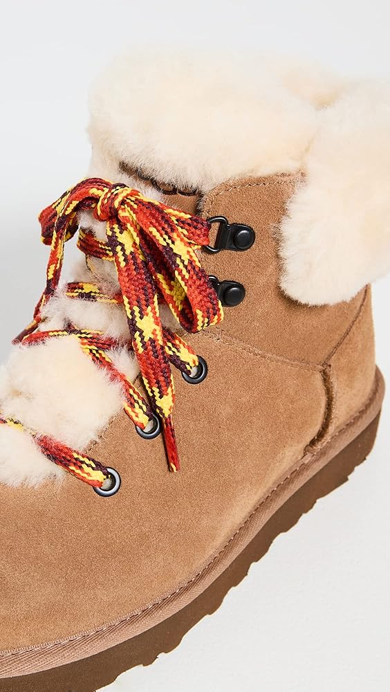 يتميز هذا الحذاء بتحديث Classic Mini بأربطة مستوحاة من التنزه وياقة ولسان من جلد الغنم المنفوش، ويتميز بنفس بطانة UGGplush™ فائقة النعومة لملمس فائق النعومة. تم تشطيبه بنعل خارجي من إسفنج SugarSole™ مصنوع من قصب السكر المتجدد، وسيحملك Classic Mini Alpine Lace طوال الموسم بأناقة.