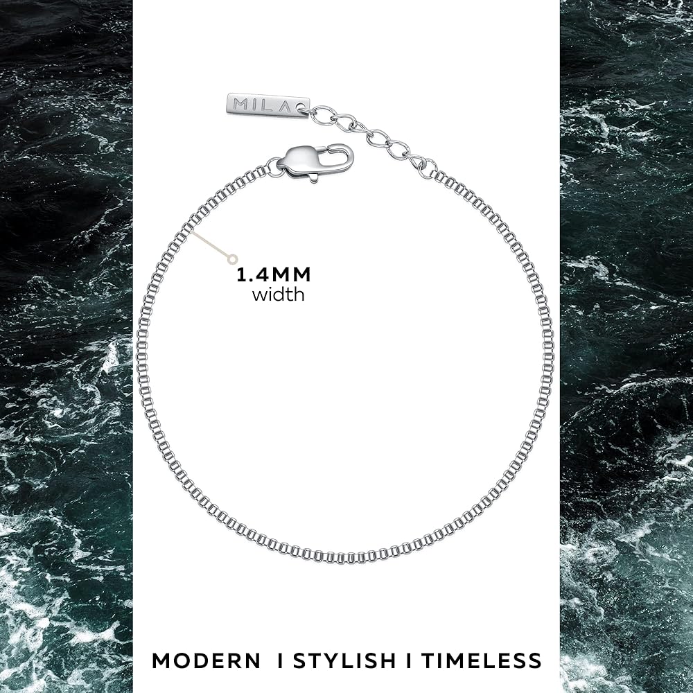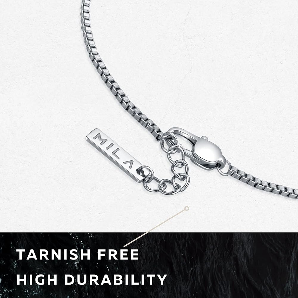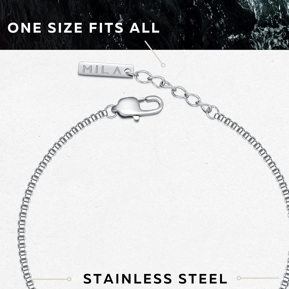 صيانة منخفضة + مقاس موحد - السوار المتدلي الأنيق من ميلا مصنوع من الفولاذ المقاوم للصدأ 316L عالي الجودة، مما يجعله خاليًا من الرصاص ولا يسبب الحساسية. مريح للغاية في الارتداء وآمن للأشخاص ذوي البشرة الحساسة. السوار قابل للتعديل ليناسب أي حجم معصم، مما يتيح لك تخصيص المقاس سواء كنت تفضله فضفاضًا أو ضيقًا. تضيف الحواف الناعمة والتصميم الأنيق للقلادة المصنوعة من الفولاذ المقاوم للصدأ لمسة من الرقي إلى هذه القطعة الخالدة.