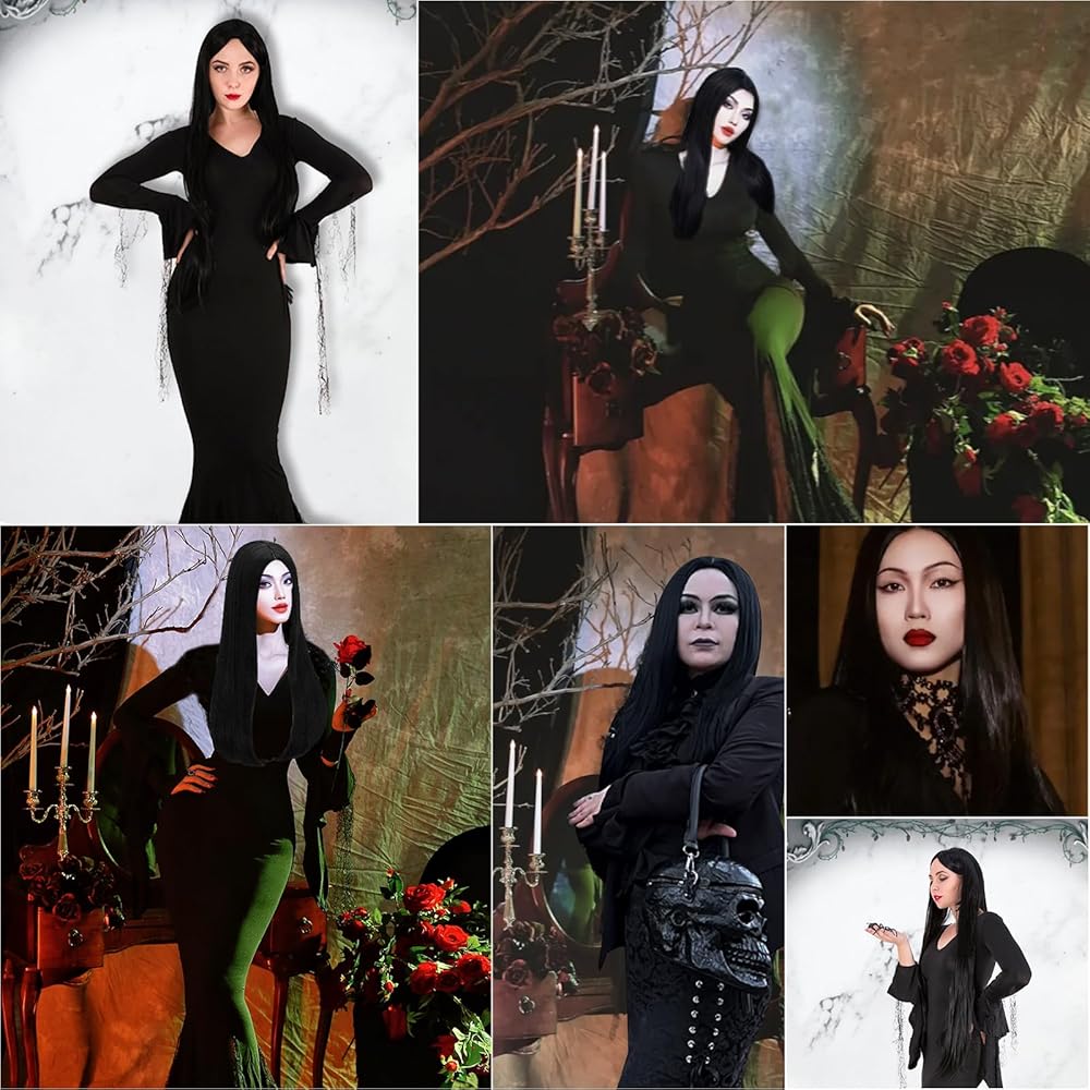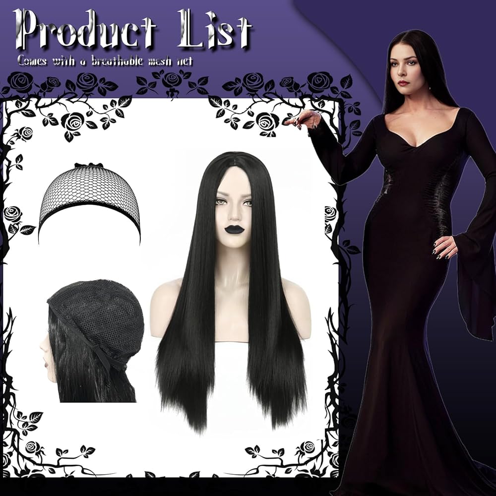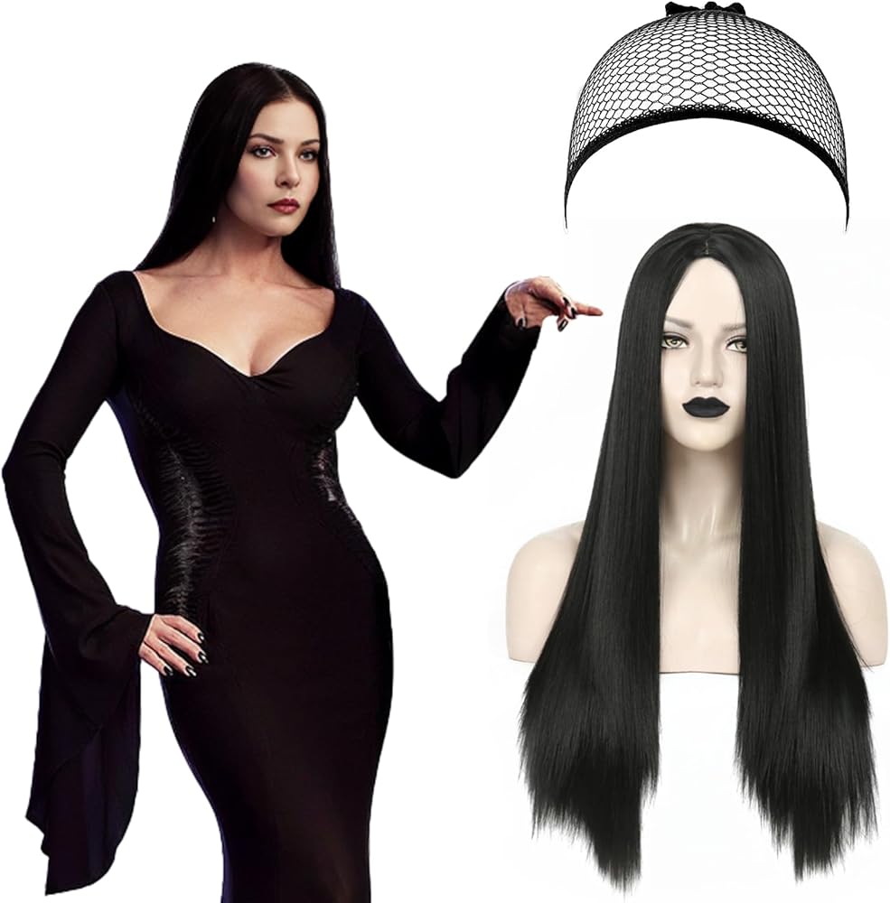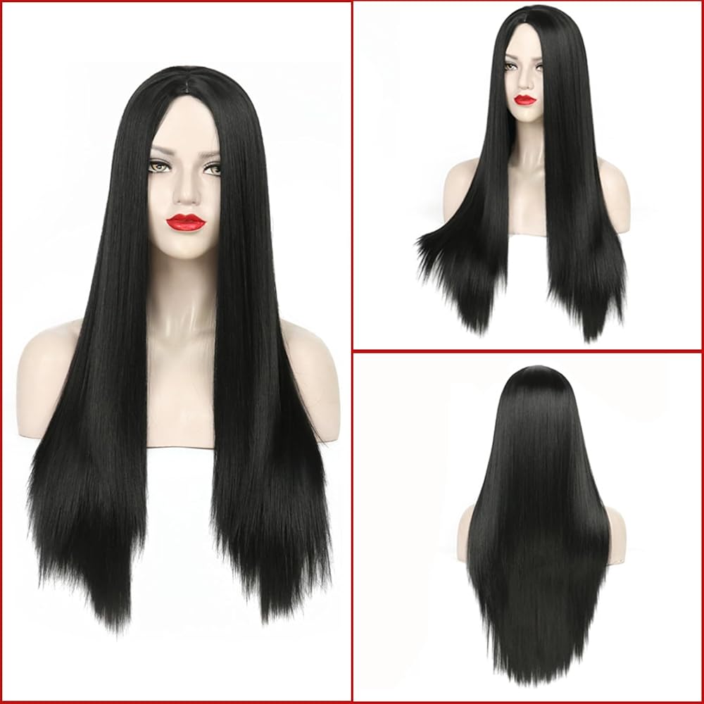 Neragron شعر مستعار طويل أسود مستقيم للنساء، 27 بوصة شعر مستعار مستقيم للجزء الأوسط من شعر مستعار لزي الهالوين، شعر مستعار أسود طويل طبيعي للاستخدام اليومي في حفلات الهالوين