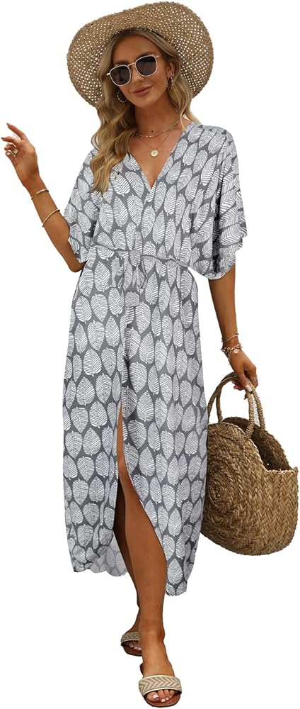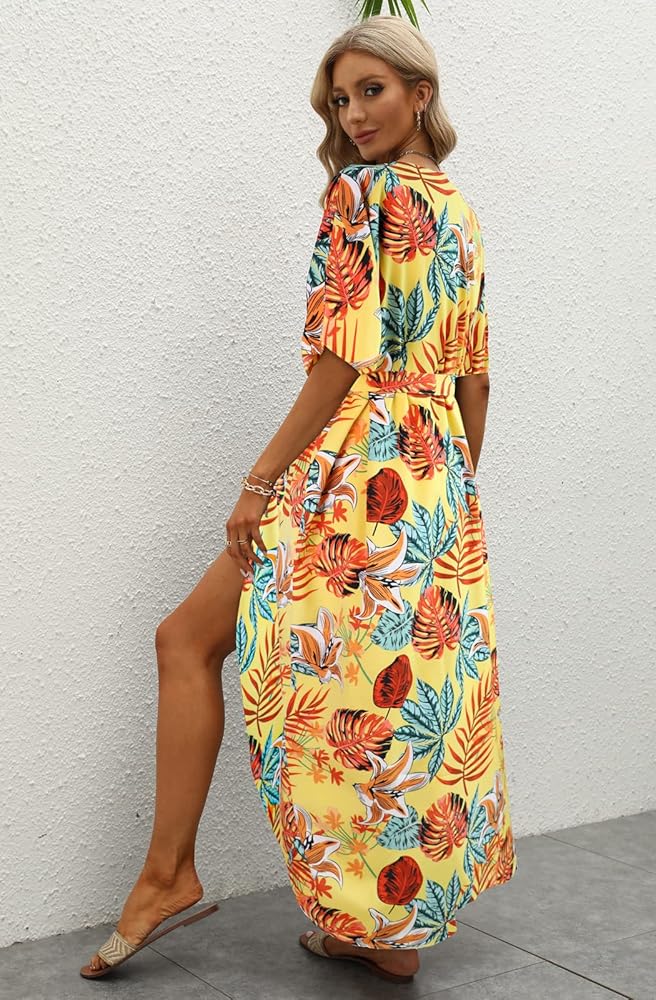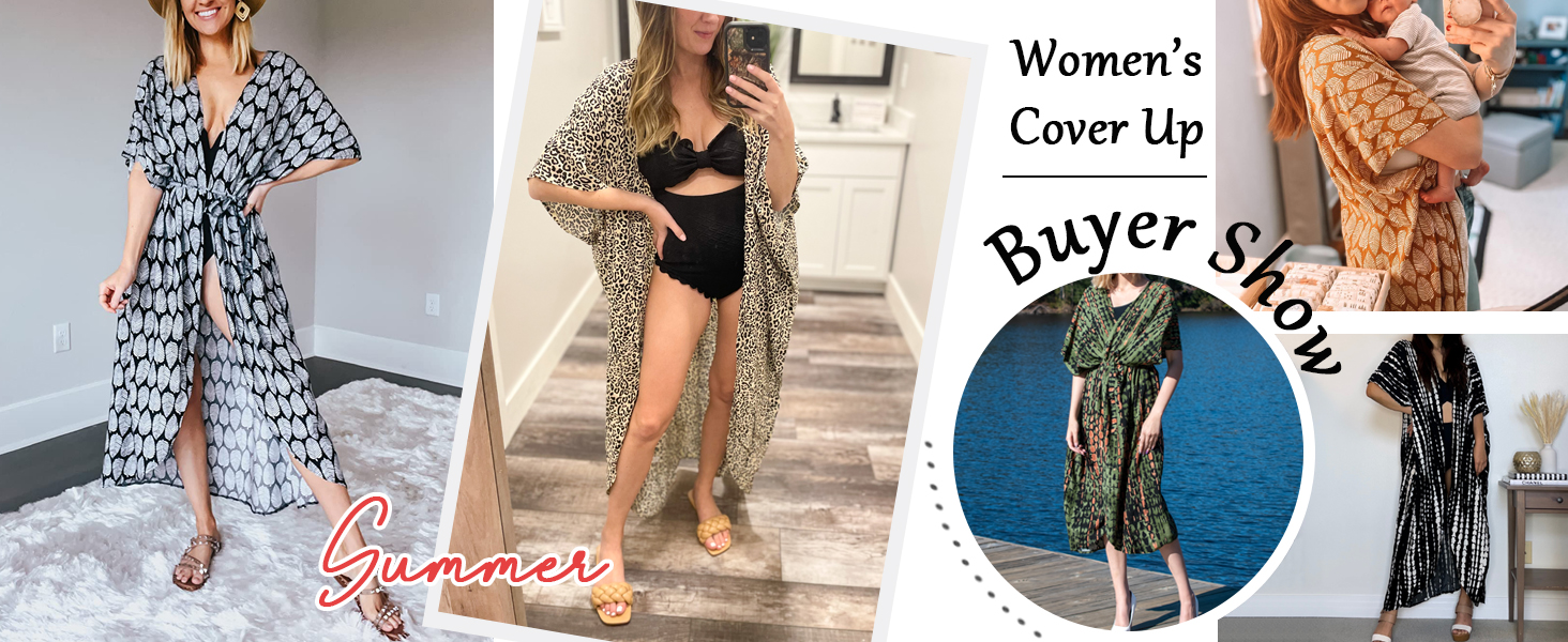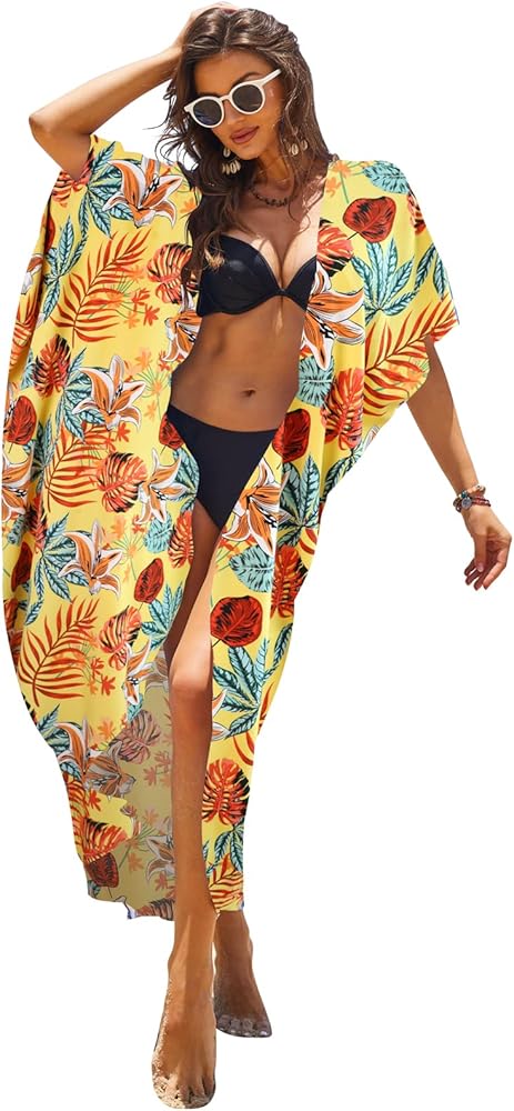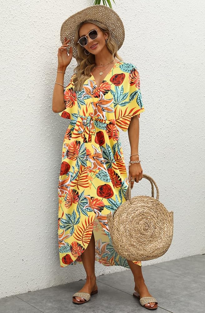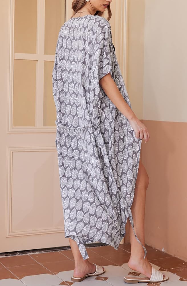 المزايا: أغطية ملابس سباحة مقاس واحد مع حزام، أكمام واسعة 3/4، حاشية منحنية، مقدمة مفتوحة، رقبة على شكل حرف V، كبيرة الحجم، طويلة، طباعة مخططة غير منتظمة وزهور أنيقة