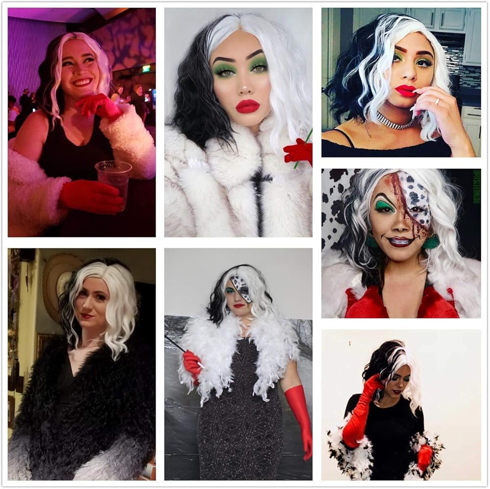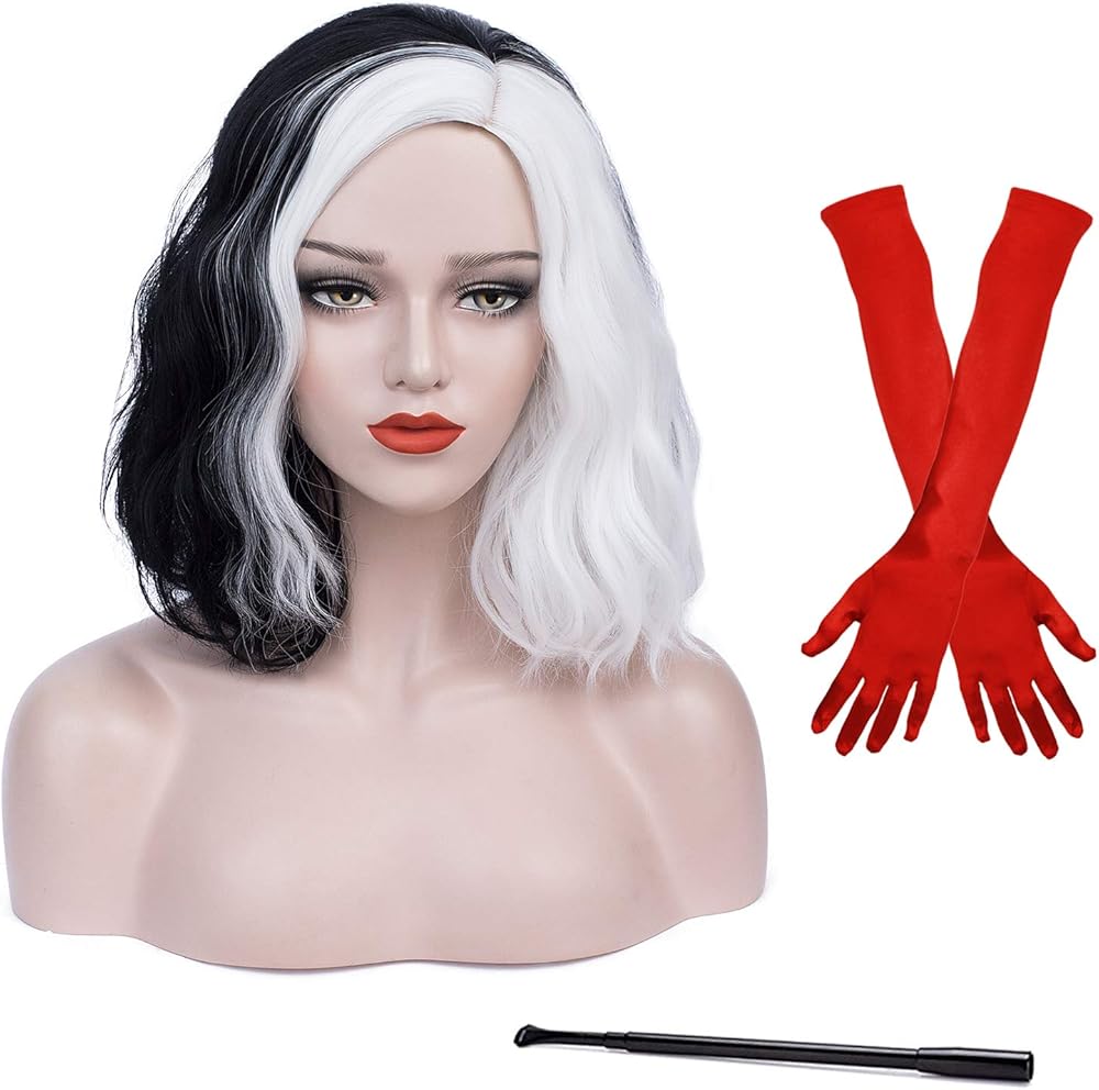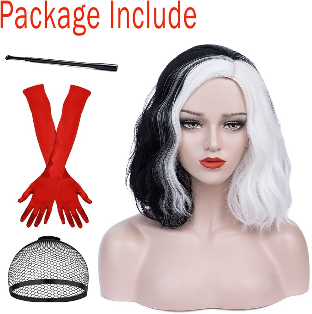 تشمل العبوة: 1 شعر مستعار أبيض أسود + 1 حامل C + 1 زوج من القفازات الحمراء + 1 قبعة شعر مستعار