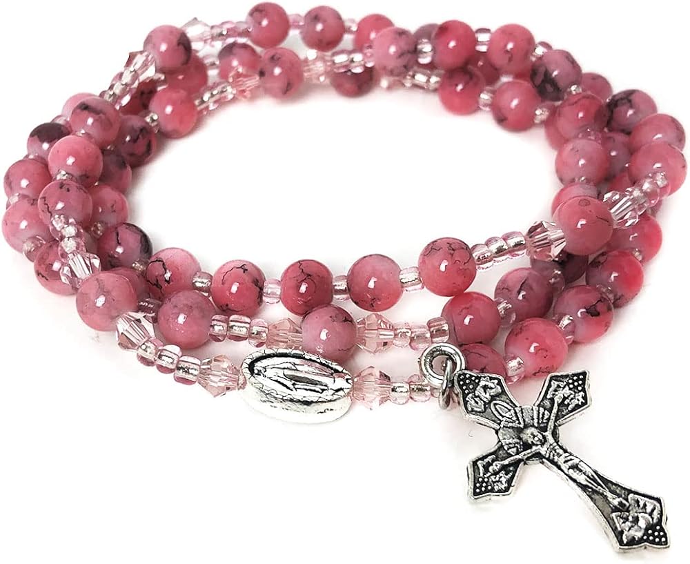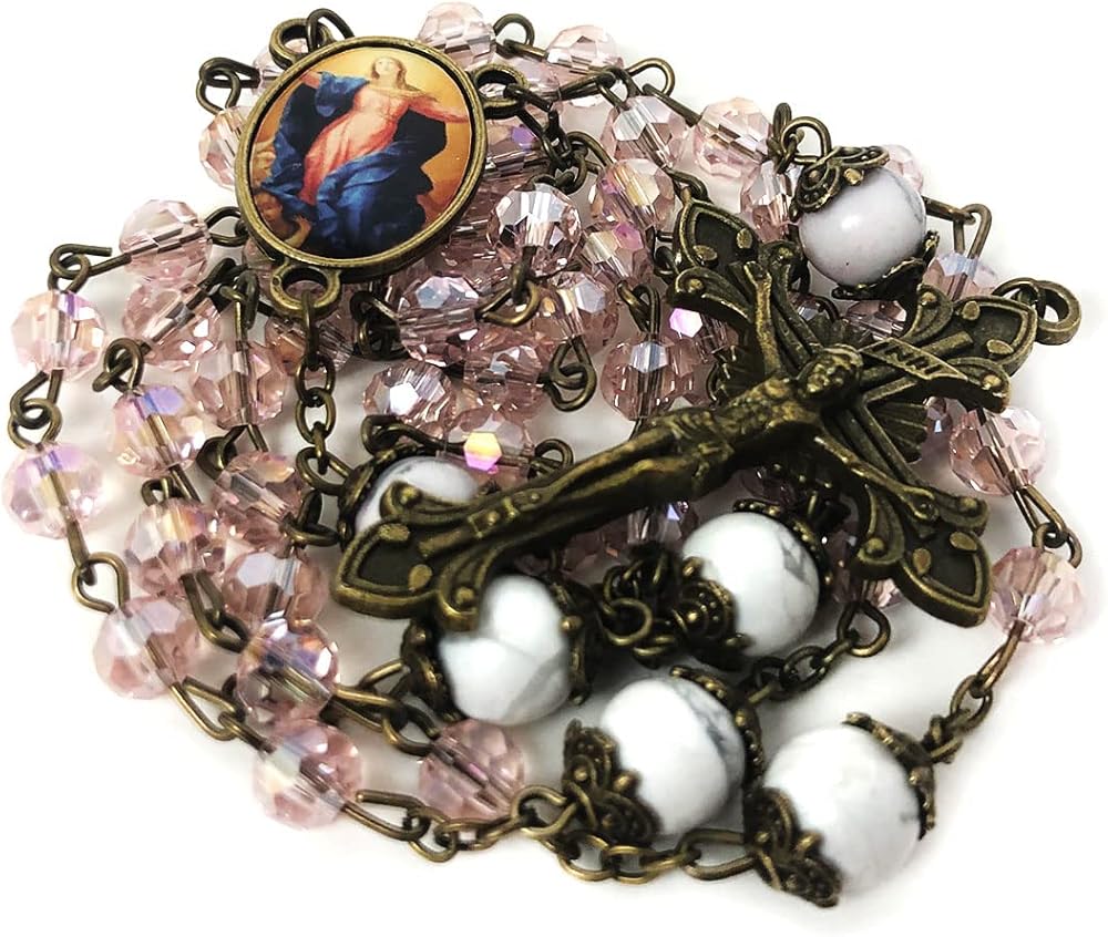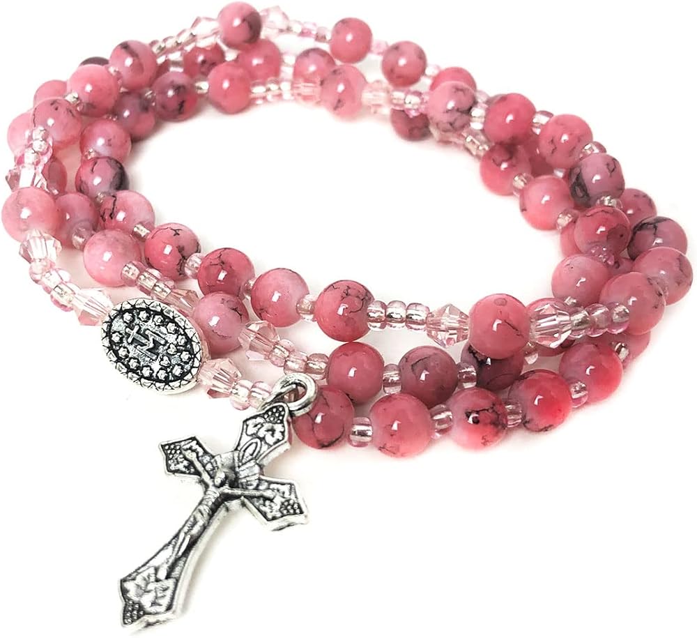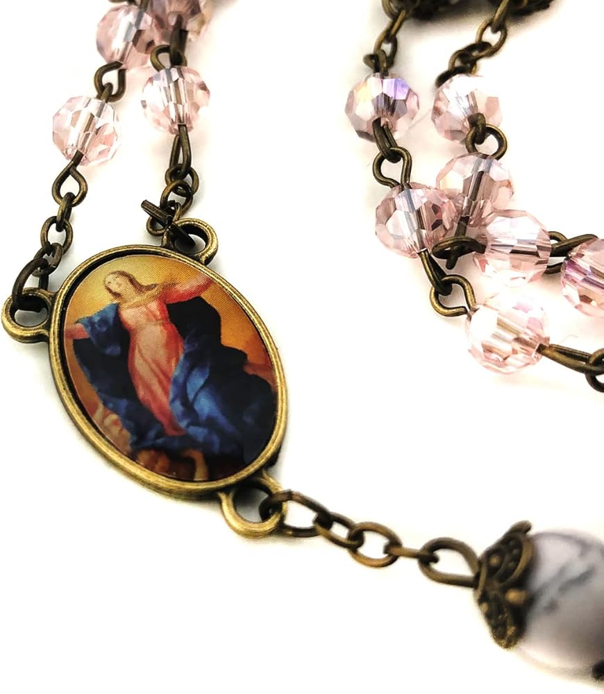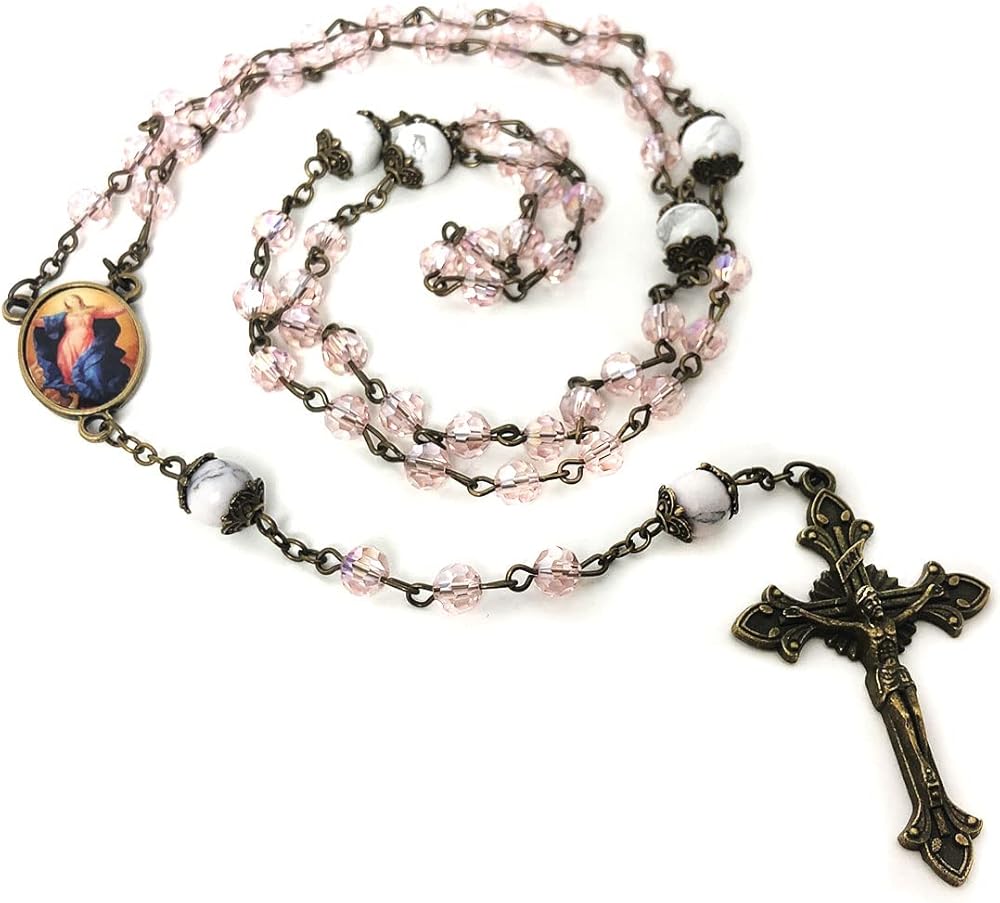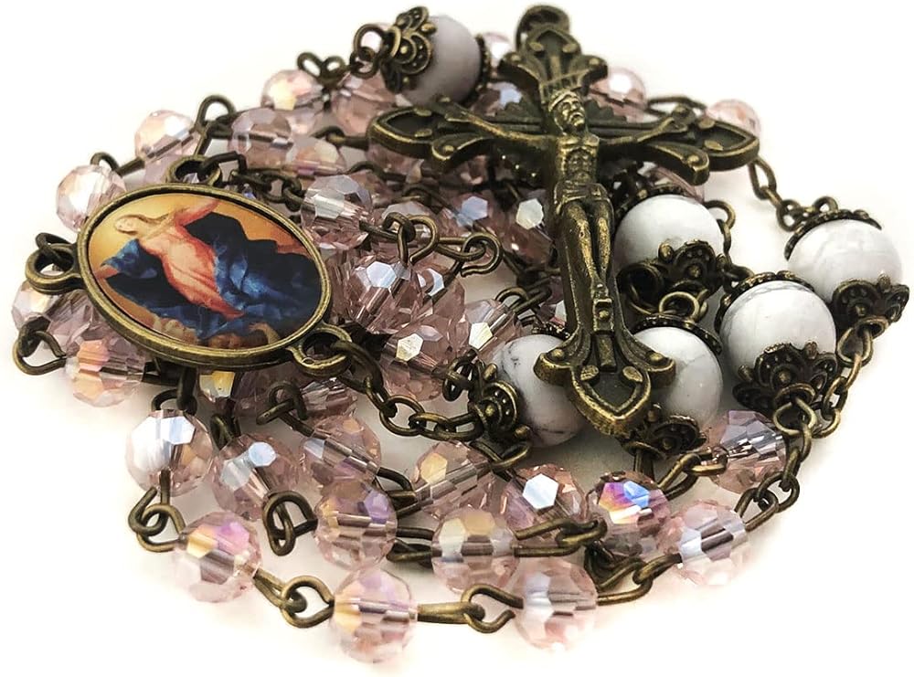 This magnificently exquisite Rosary and Miraculous Medal Rosary Bracelet set features stunning 6 mm Pink Crystal beads and gorgeous White Howlite Our Father beads. Beautiful Assumption of the Virgin Mary Centerpiece. Approximate length is 80 cm (31.5 in). Praying the rosary with your family or with members of your faith community is also a great way to use the prayer as a way to spend time in Catholic fellowship with others. These Rosary mysteries are stories from the new testament and the goal of the rosary is that while those prayer repetitions keep you focused you're really thinking about the mystery associated with each decade. While the rosary itself is a decidedly Marian practice, almost all of the mysteries of the rosary walk you through the life of Jesus. Even if you do choose to say your rosaries by yourself, they can still bring you closer to others. While some people use the rosary strictly as a meditative tool, many people also say the rosary with an “intention.” Your intention can be anything that you want to use the rosary to pray for. If you don't have specific intentions, you can pray for something else, like the souls in Purgatory or the intentions of the Holy Father, the Pope. Perfect baptism gifts for girl, first communion gift for girls or boys, confirmation, christening gifts for boys or girls. Makes a beautiful birthday gifts for women, grandma gifts, gifts for her, christmas gifts, gifts for mom, gifts for grandma, anniversary gifts or any occasion. Also includes matching Rosary Bracelet with adjustable length. Designed exclusively by Catholic Heirlooms in California, USA.