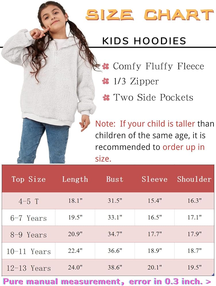 Features: Girl's fuzzy hoodies, long sleeve pullover sweaters, warm hooded pullover, 1/3 zip up collar hoodies, two side pockets to keep your hand warm, slouchy style.