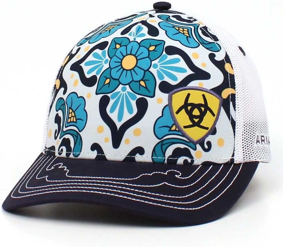 قبعة Ariat للسيدات جميلة ومريحة من M&F Western Products. لوحة أمامية مطبوعة بالزهور مع درع أريات أوفست. فاتورة بحرية وشبكة خلفية بيضاء مع إغلاق خلفي سريع.