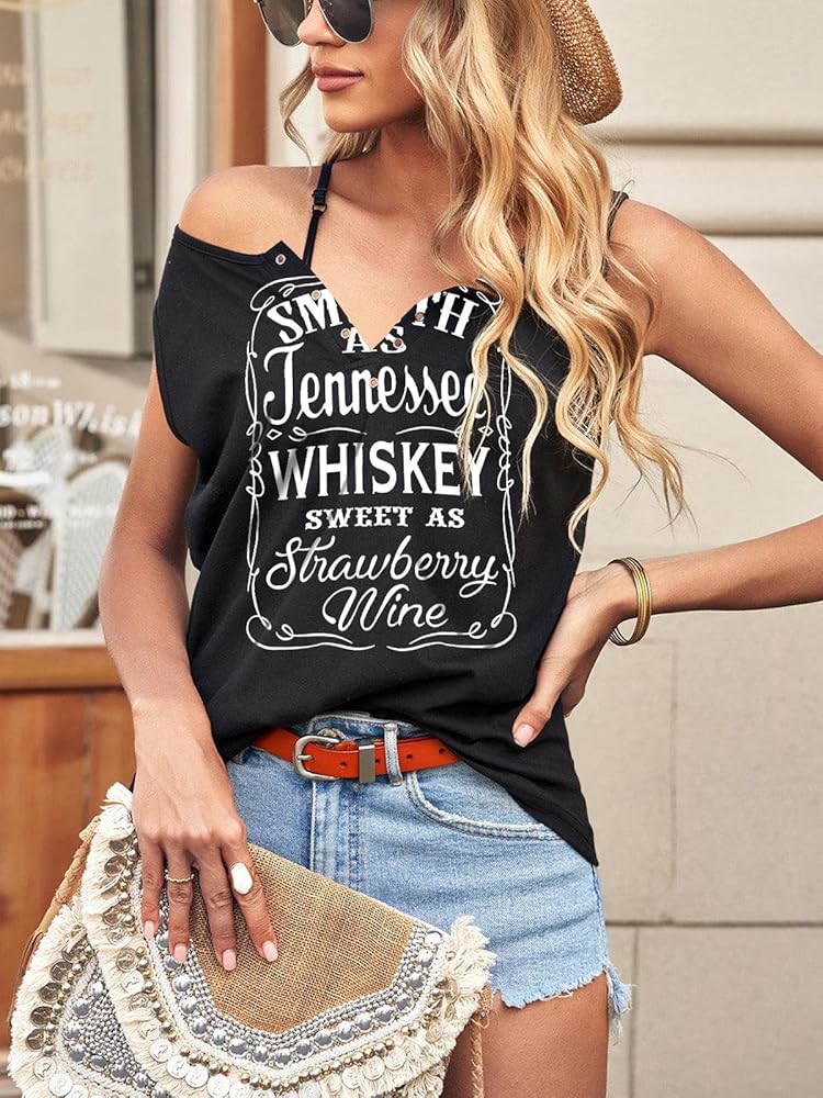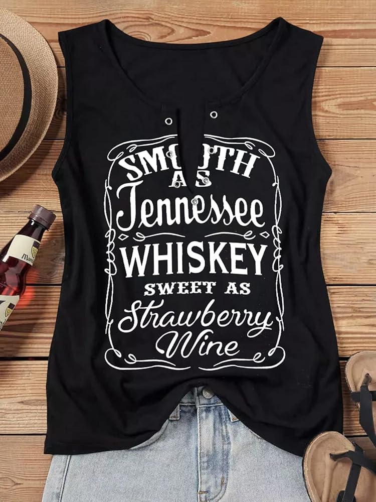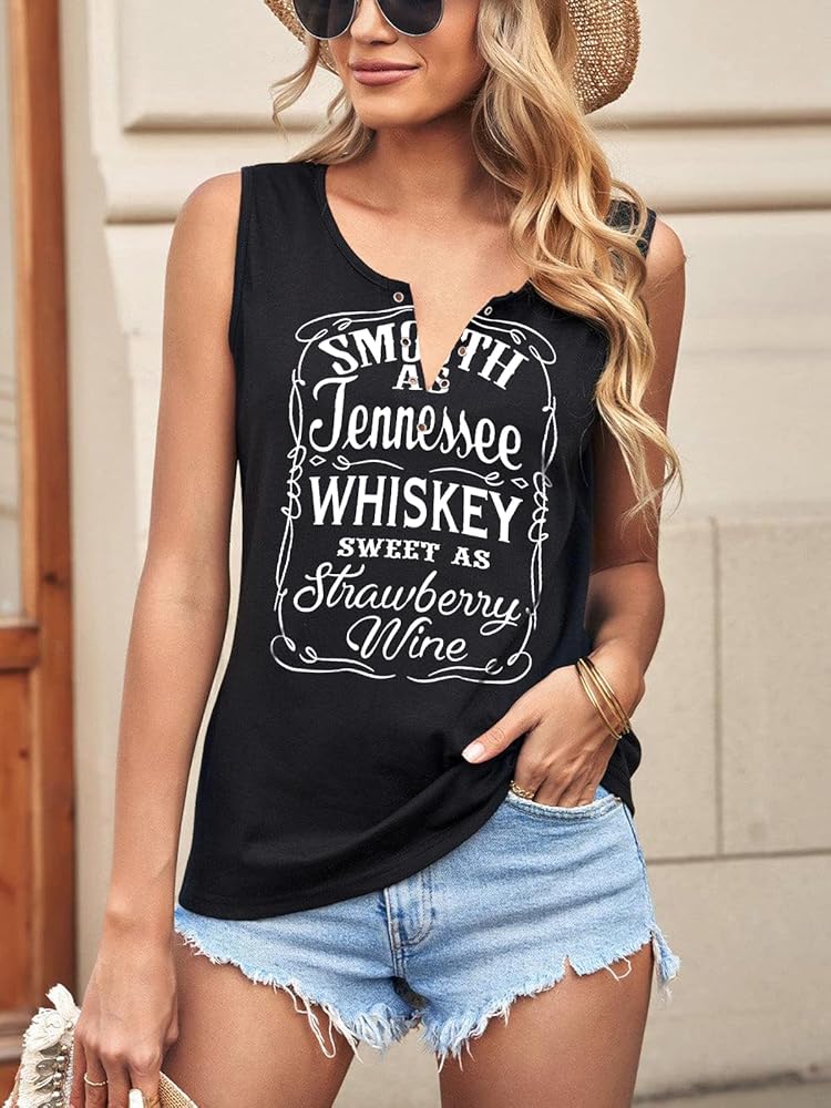 Feature: country concert shirts for women, whiskey graphic vest tees, country music tank, smooth as tennessee whiskey letter print sleeveless tops, vintage ring hole deep v-neck design, show your sexy charm.
