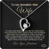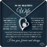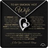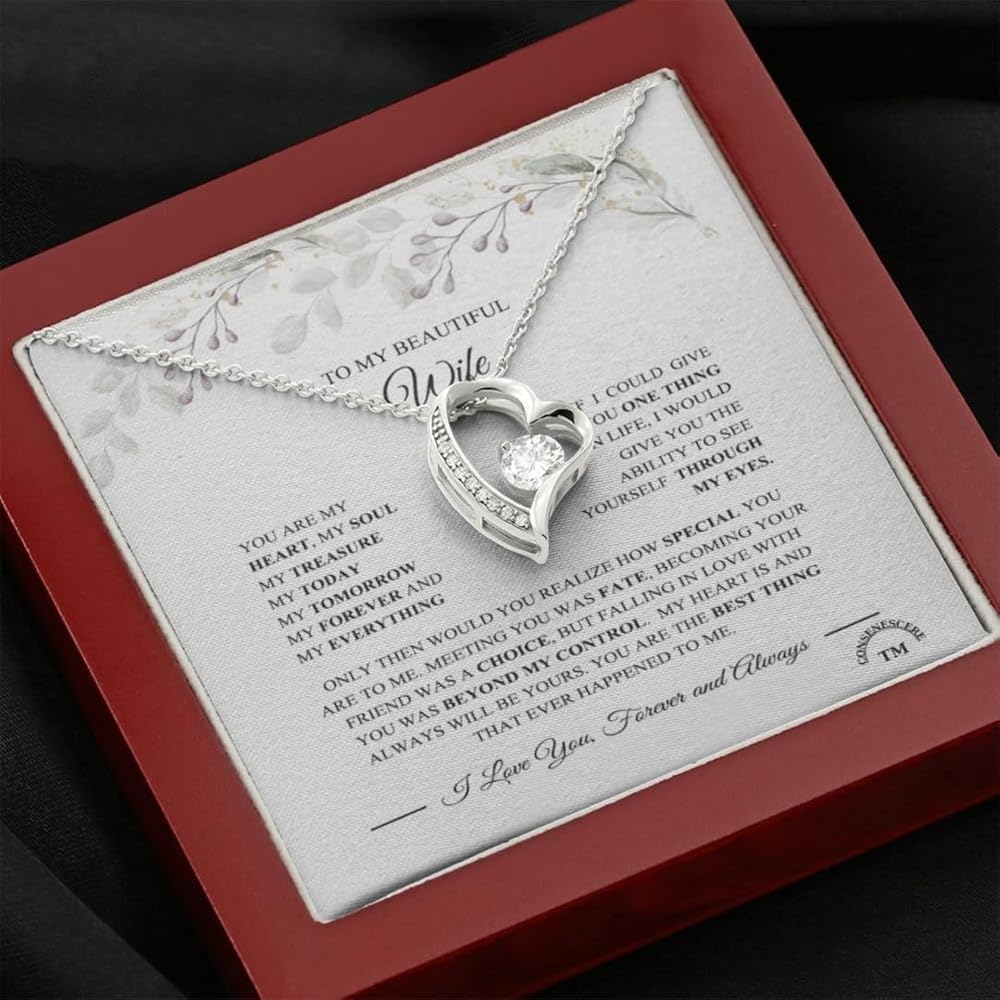 بطاقة رسالة: "إلى زوجتي الجميلة. إذا كان بإمكاني أن أعطيك شيئًا في الحياة، فسوف أعطيك القدرة على رؤية نفسك من خلال عيني. عندها فقط ستدرك مدى تميزك بالنسبة لي وأنك أفضل شيء "هذا ما حدث لي من قبل. ضغطت على هذه القلادة بقوة وملأتها بحبي وضيائي. إذا لم أكن هنا أبدًا وكنت بحاجة إلى عناق، فقط أمسك هذه القلادة بالقرب مني لتشعر بحبي. أحبك، إلى الأبد ودائمًا. "