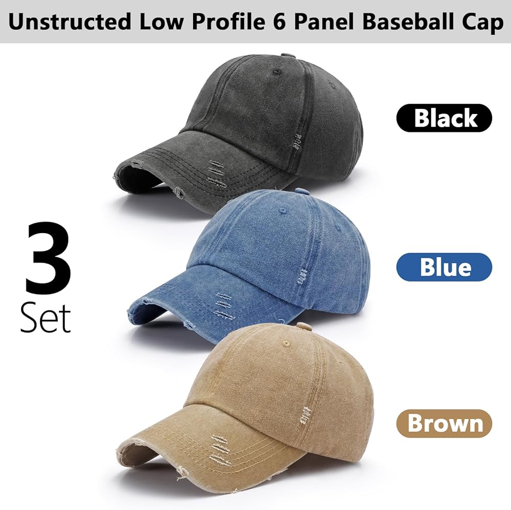 3 عبوات من قبعة البيسبول المغسولة البسيطة، قبعة الأب القطنية المتعثرة ذات المظهر المنخفض، قابلة للتعديل للنساء والرجال