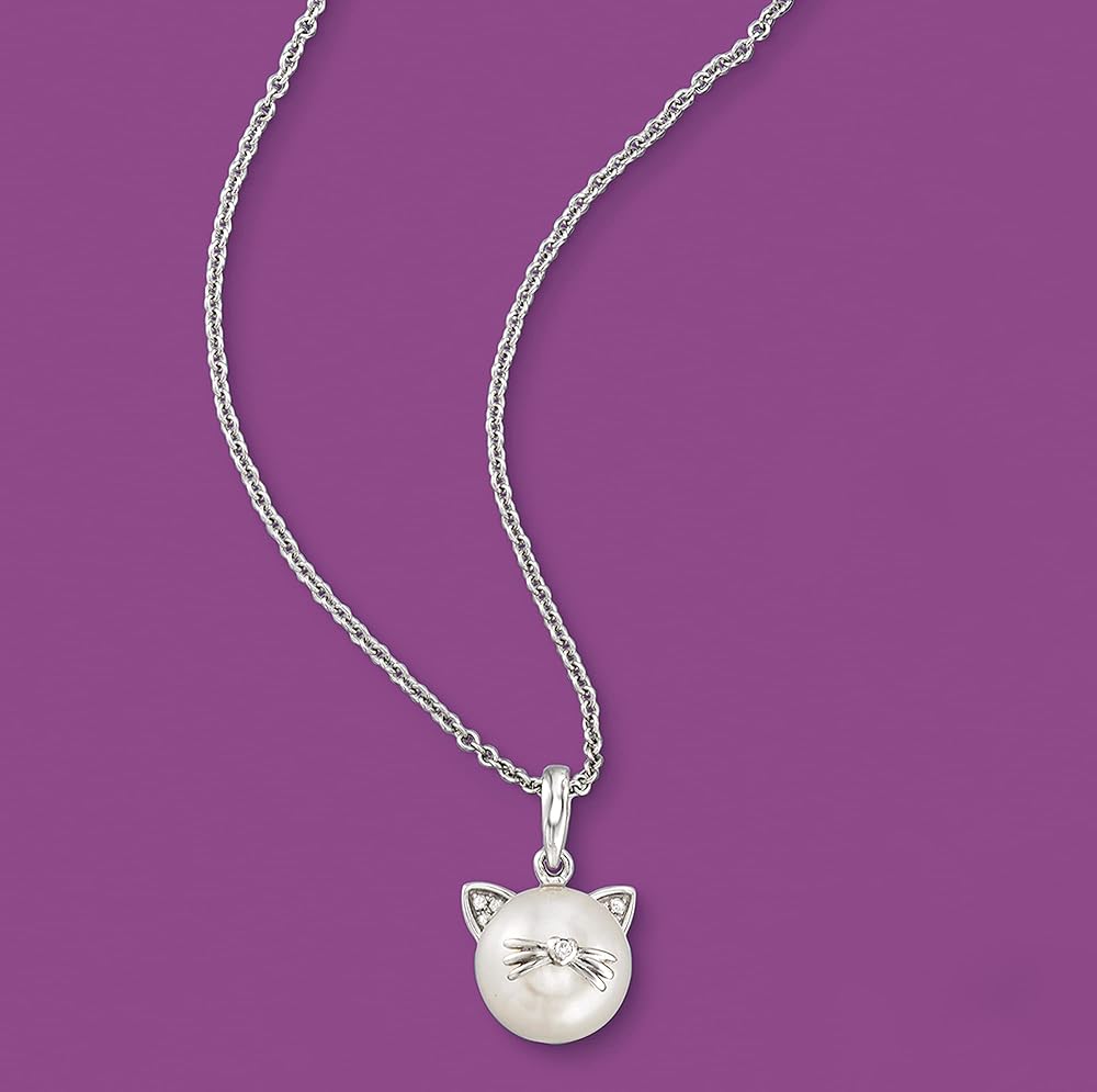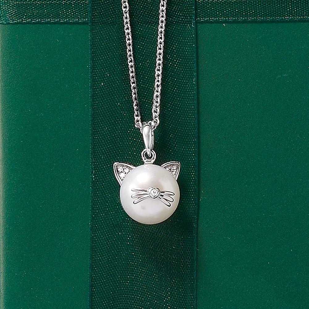 PEARL AND DIAMOND ACCENTS IN STERLING SILVER — 9-9.5mm cultured pearl cat pendant necklace with diamond accents in sterling silver. Cultured freshwater button pearls. Polished finish. Single bale cat pendant fits chains up to 3.2mm and is 5/8 in. long by 3/8 in. wide. Suspends from an 18 in. long by 1.1mm wide cable chain with a 2 in. extender. Lobster clasp.