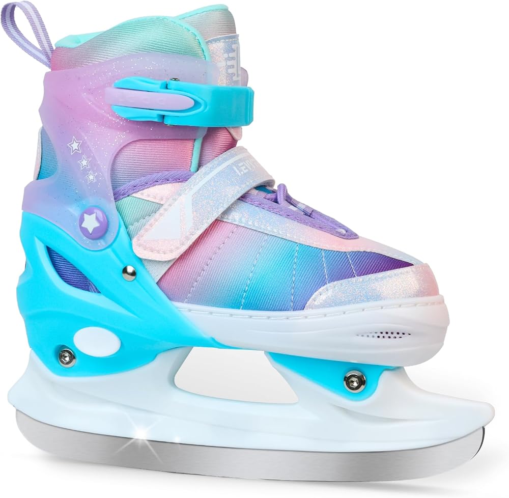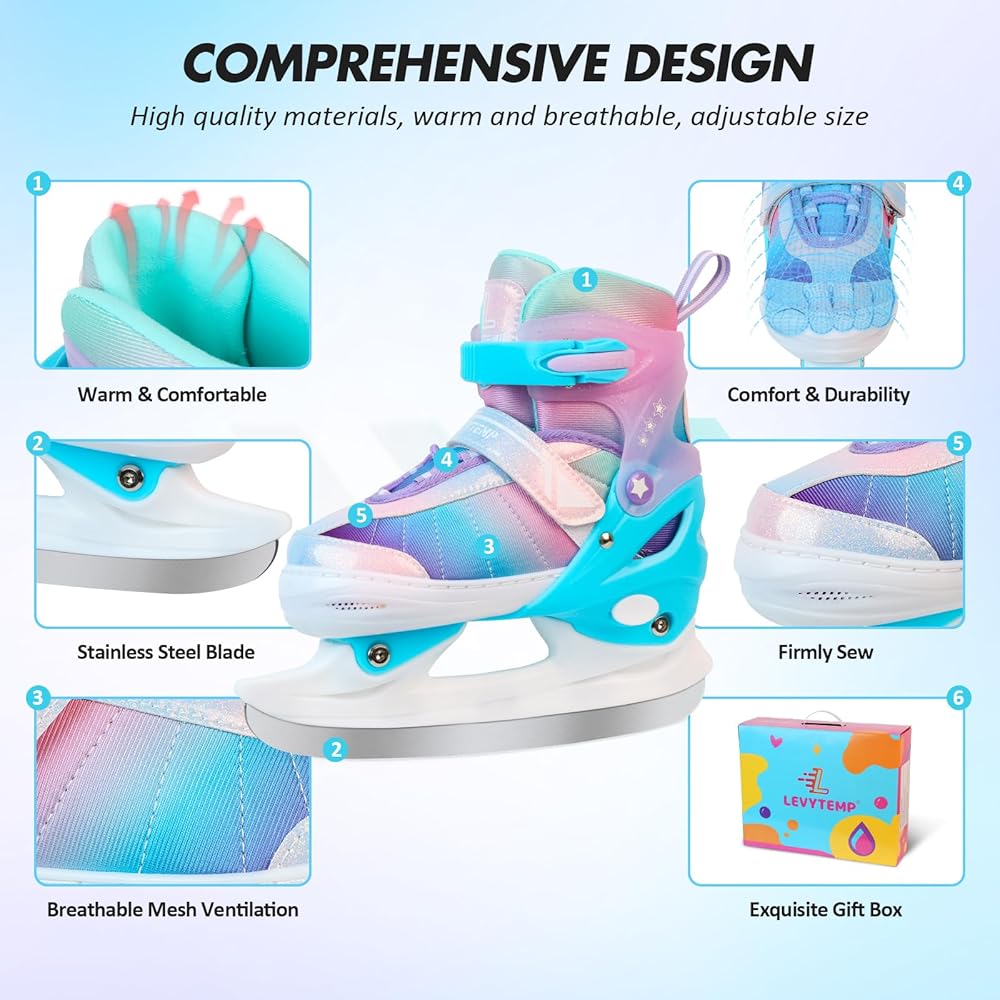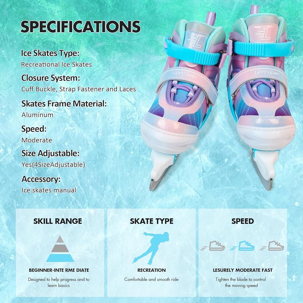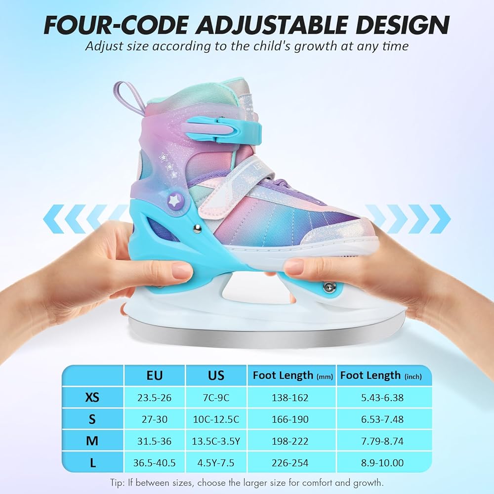 ICE SKATE ADJUSTABLE: Our ice skates are available in three sizes - Small (10-13C), Medium (1-3Y), and Large (4-7Y) - The shoe size is small, it is recommended to buy one size larger.Each featuring four gear adjustments. This allows for effortless customization of the Ice skates to provide a perfect fit for your child's feet, ensuring maximum comfort and a secure fit while they skate. Designed to grow with your kids, these youth ice skates eliminate the need to purchase new ones each year.