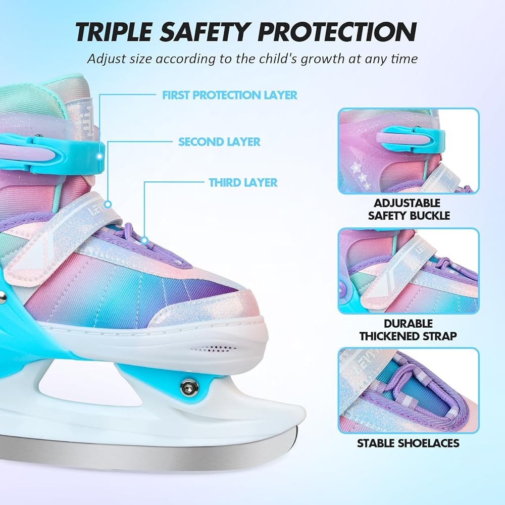 TRIPLE PROTECTION: Our ice skates prioritize safety with triple protection, featuring buckles, powerful Velcro, and shoe ropes. These measures ensure your child's feet are secure and protected during their ice skating experience.