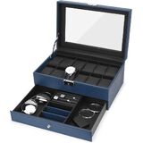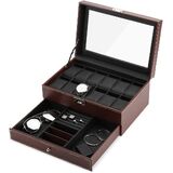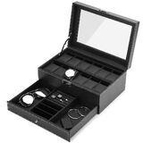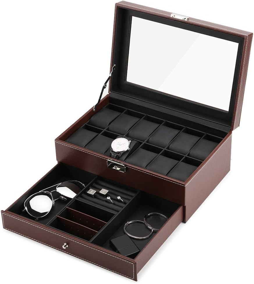 طبقة مزدوجة: في الطبقة العليا من علبة المجوهرات، يوجد 12 فتحة للساعة مع وسائد قابلة للإزالة. وفي الطبقة السفلية، توجد مساحة مناسبة كافية لأزرار الأكمام والقلائد والأساور والأقراط والدبابيس وربطات العنق والنظارات الشمسية وأي مجوهرات وممتلكات أخرى.