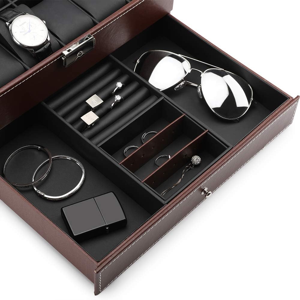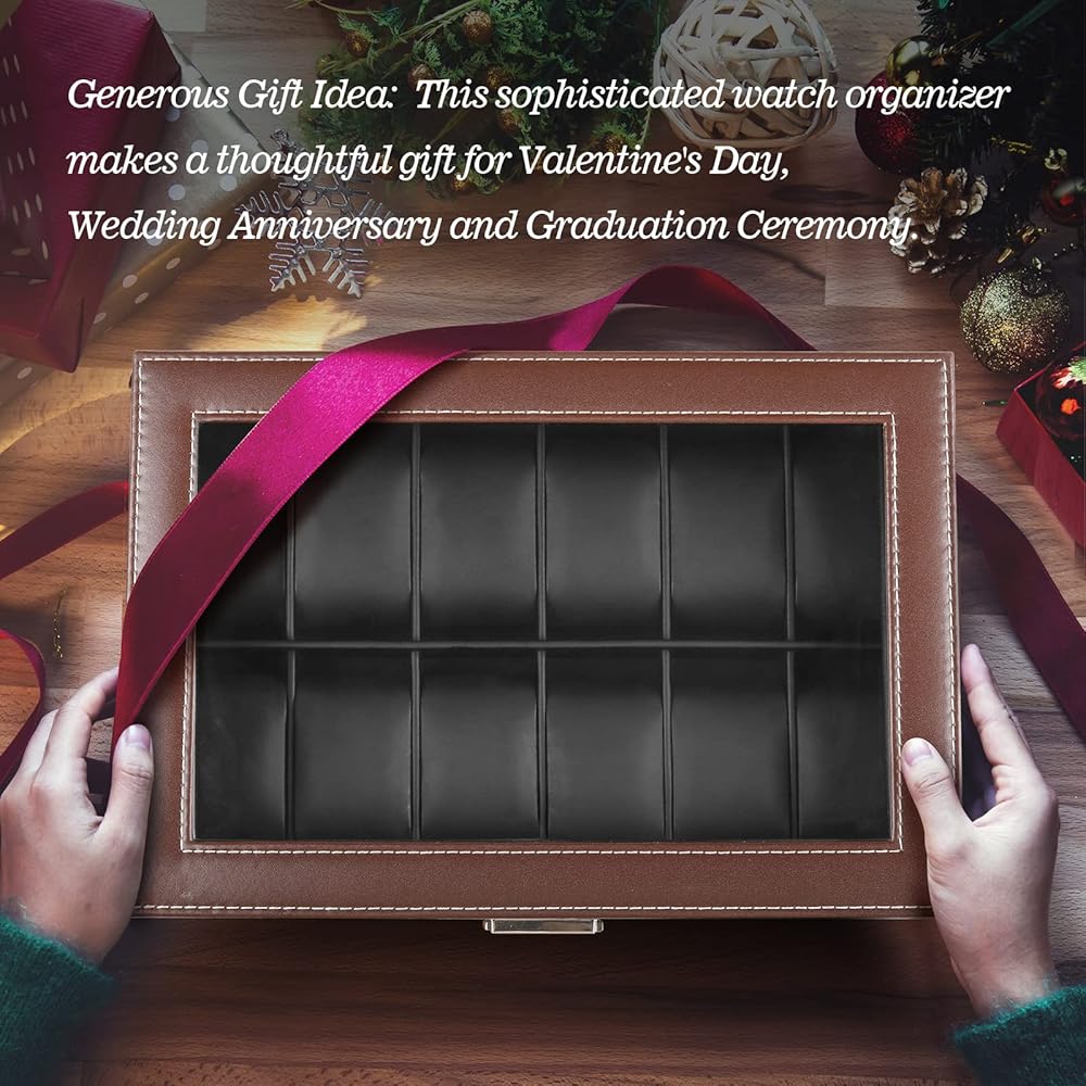 تصميم فريد: مصنوع من جلد صناعي عالي الجودة، منظم الساعات الرجالي هذا رائع ورائع وراقي. وهي سهلة التنظيف. كل ما عليك فعله هو مسح منظم علبة العرض بقطعة قماش