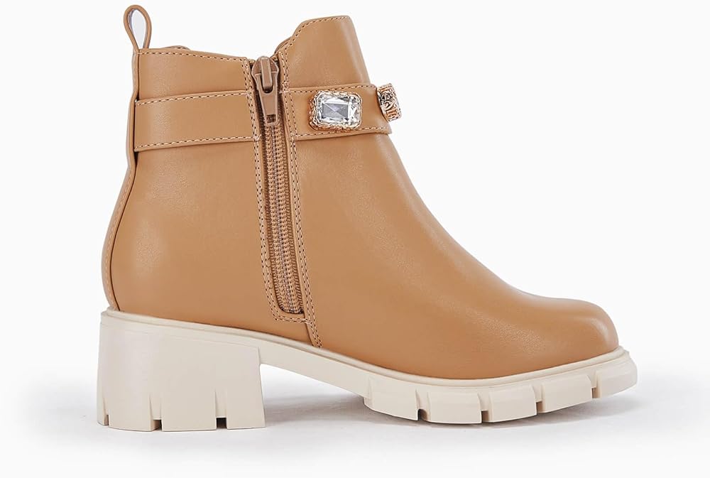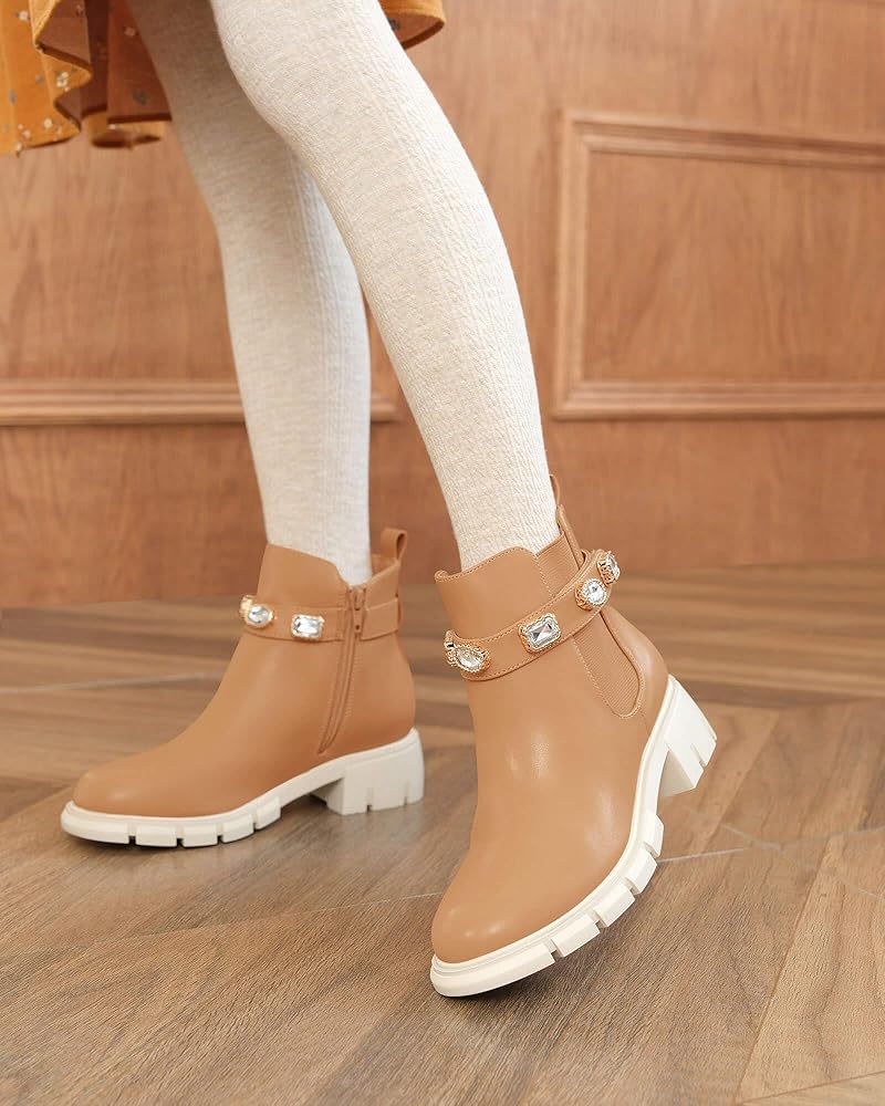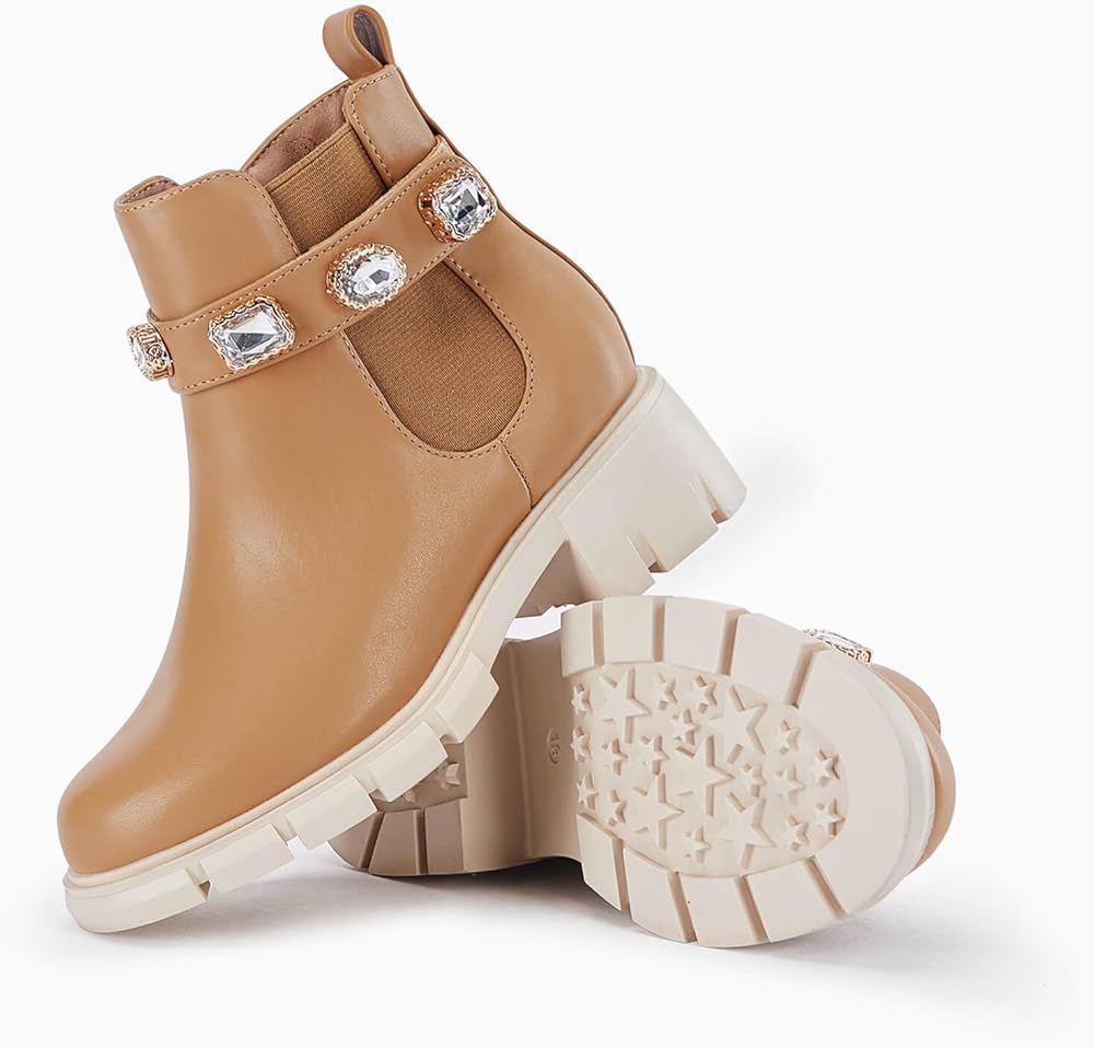 Feature: Chelsea ankle boots for girls, platform chunky block heel, round toe, lug sole, side zipper, solid color, large rhinestone jewels belt around the top shaft