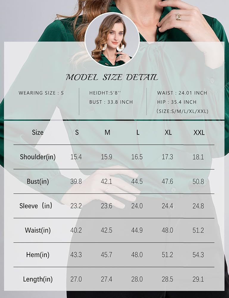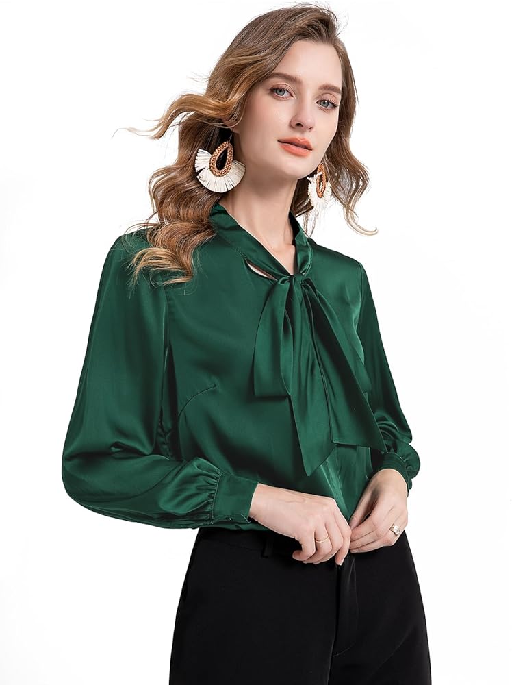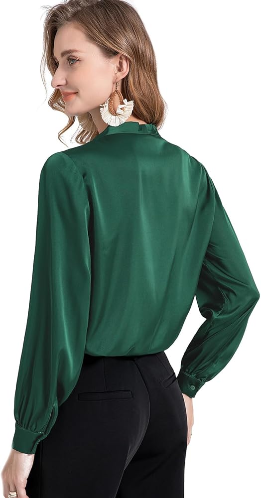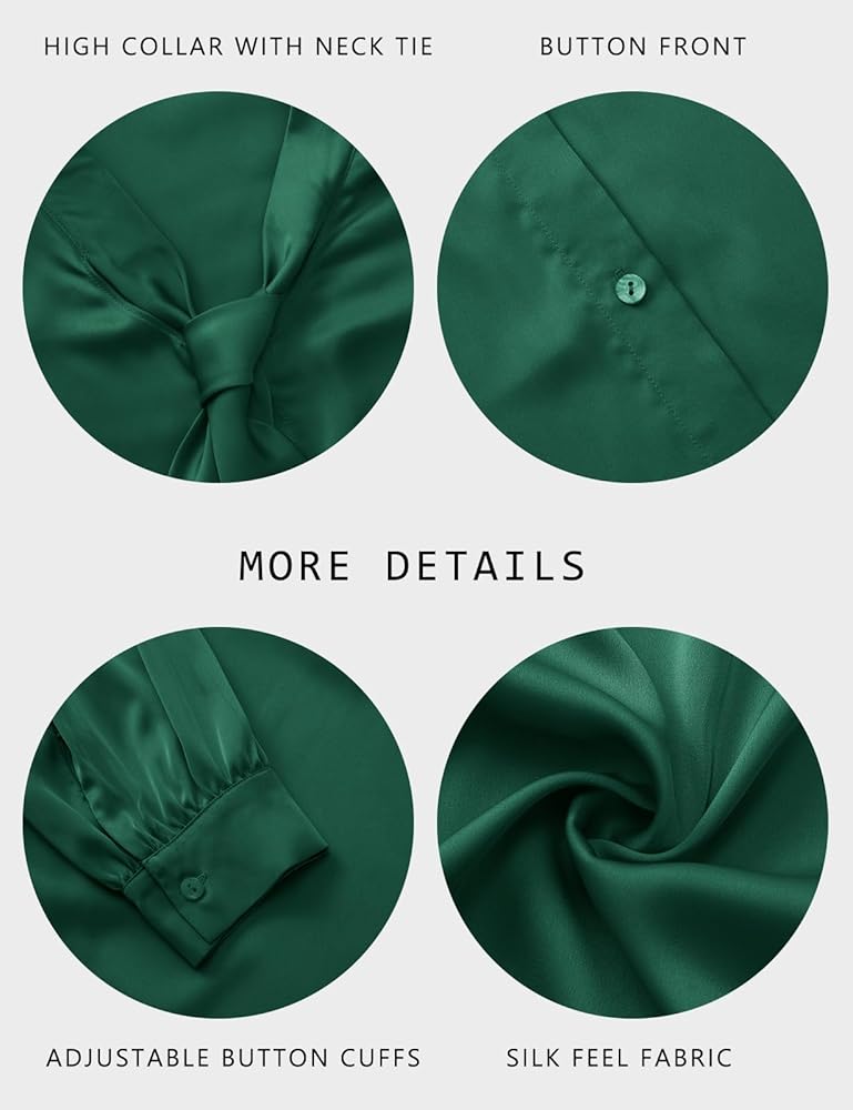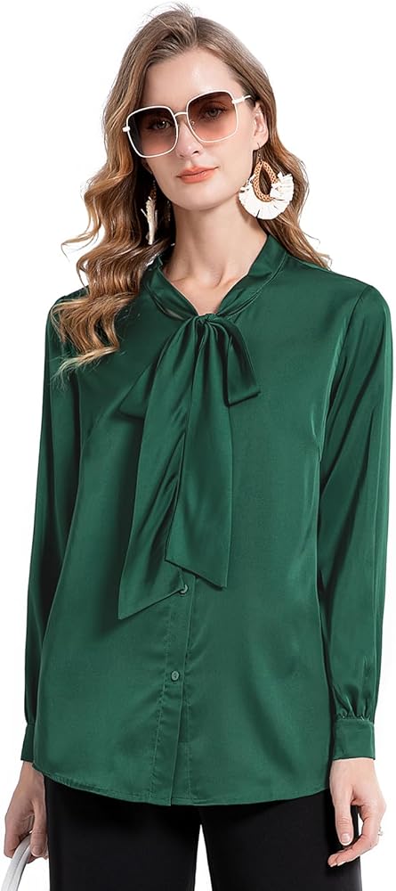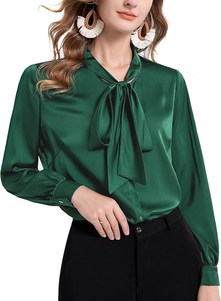 كلاسيكية: بلوزة من الحرير الساتان تعرض زر إغلاق أمامي، ورقبة على شكل فيونكة، وأساور أكمام بأزرار، مما يوفر مجموعة من خيارات التصميم لأي مناسبة. تصميم رائع يعطي شعوراً بالنبل والاحترافية، ويضيف لمسة من الأناقة إلى عملك اليومي.