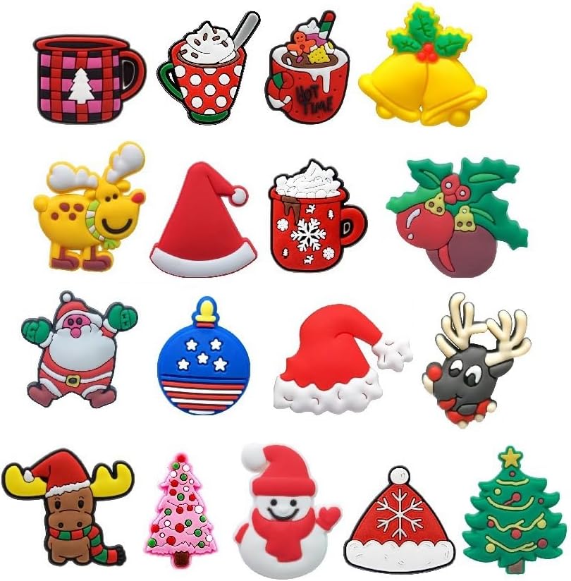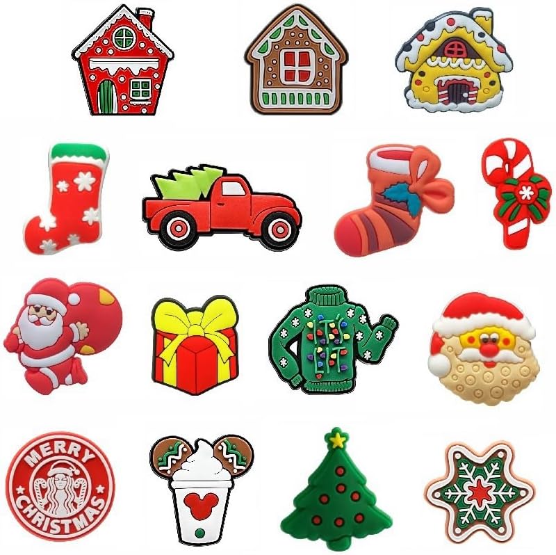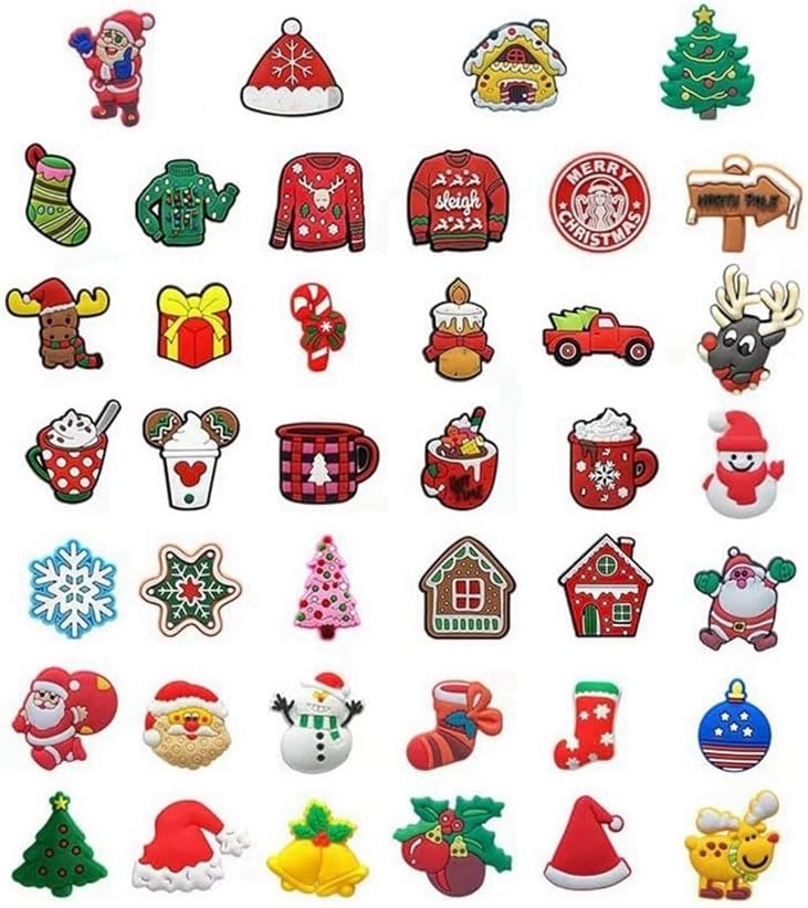 سحر أحذية عيد الميلاد: تشكيلة موضوع عيد الميلاد تحتوي على 40 قطعة، بما في ذلك سانتا كلوز، وأشجار عيد الميلاد، وهدايا عيد الميلاد،