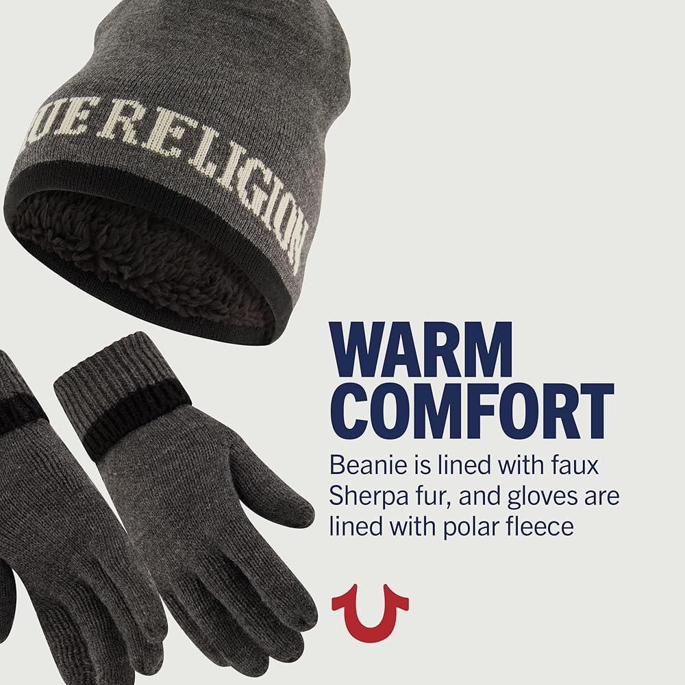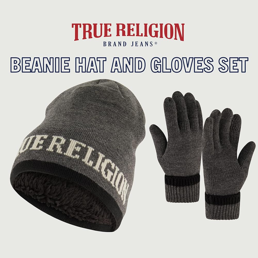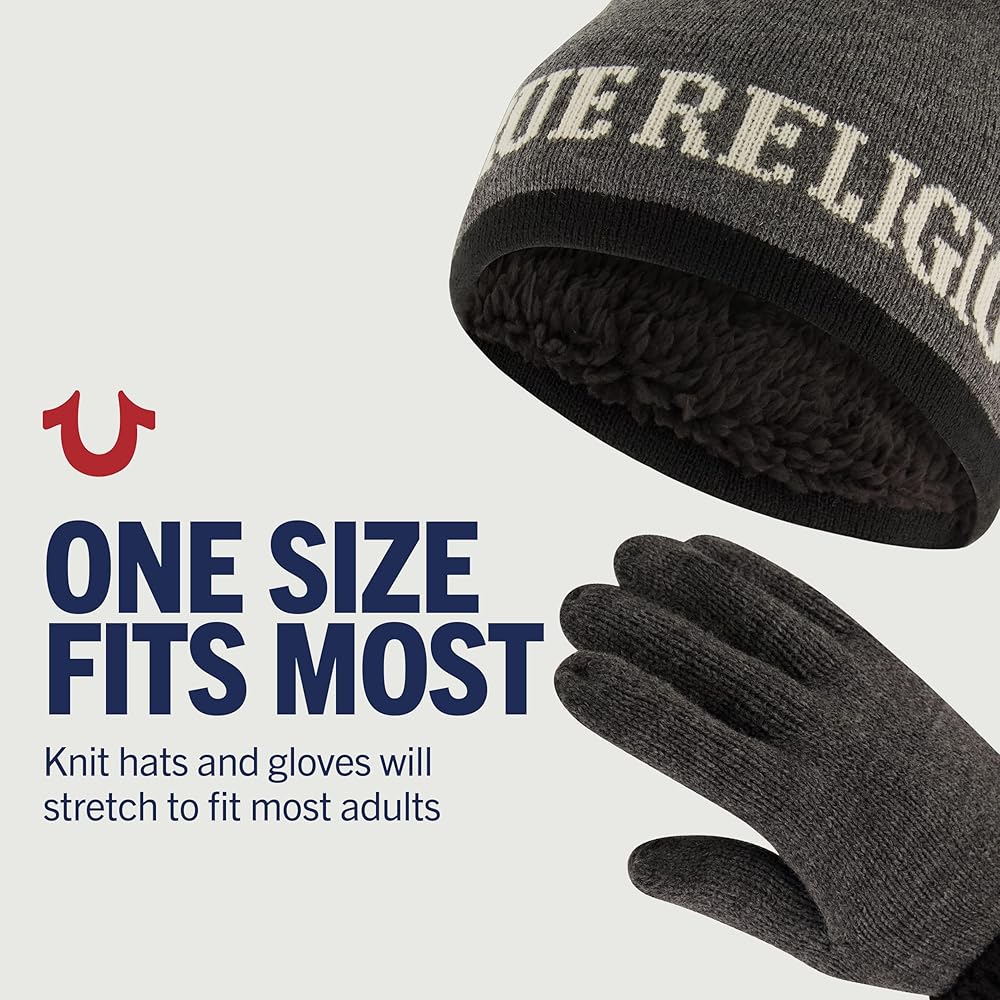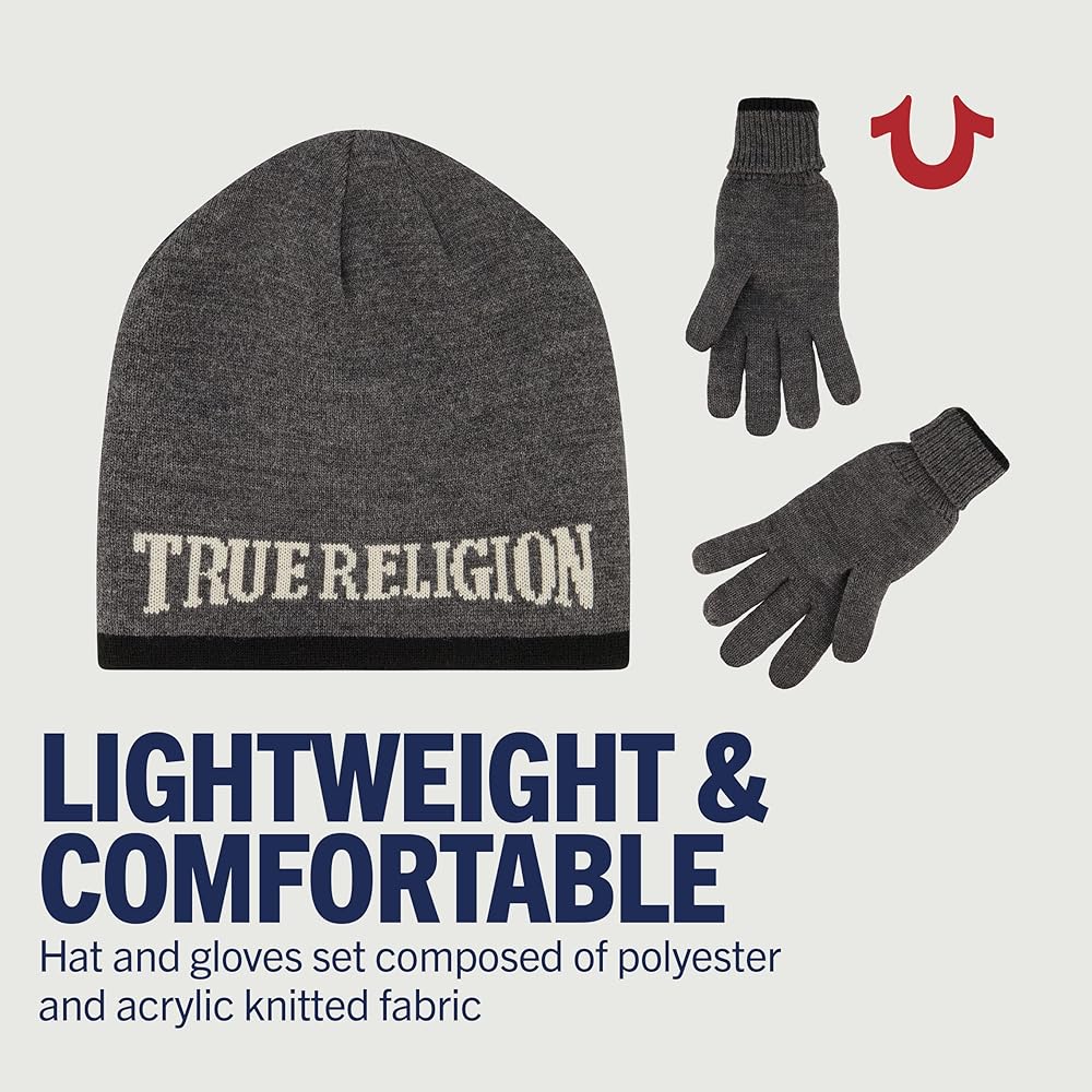 مجموعة قبعة وقفازات محبوكة حقيقية: قبعة جمجمة مريحة وعصرية ومجموعة قفازات متطابقة؛ تتميز القبعة بشعار True Religion من قماش الجاكار على الجزء الأمامي من القبعة