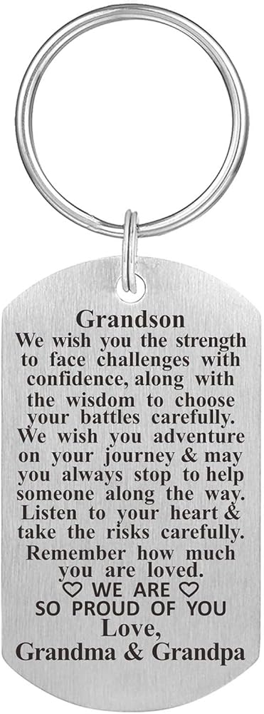 Inspirational Quote Message Jewelry for Grandson Granddaughter: My Grandson Granddaughter, I wish you the strength to face challenges with confidence along with the wisdom. To choose your battles carefully. I wish you adventure on your journey and may you always stop to help someone along the way. Listen to your heart and take the risks carefully. Remember how much you are loved. I am so proud of you. Love Grandma and Grandpa