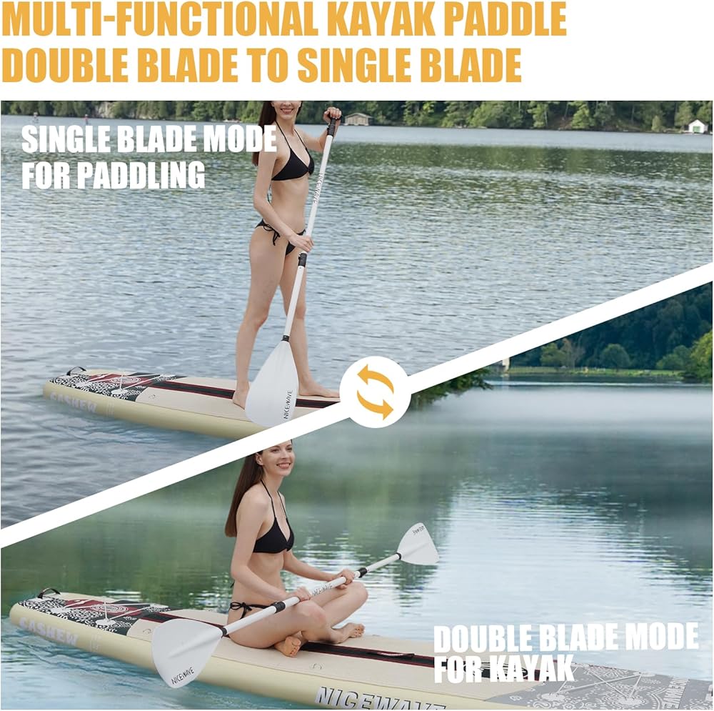 • [الملحقات والضمان] الملحقات الاحترافية: حامل الكاميرا، سلسلة الأمان، مضخة مزدوجة العمل، زعانف قابلة للإزالة، 4 قطع من مجداف الكاياك العائم من الألومنيوم، حقيبة هاتف مقاومة للماء، حقيبة جافة سعة 5 لتر، حقيبة ظهر. وتقدم لك NiceWave ضمانًا لمدة عام واحد.