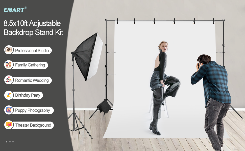 Emart Heavy Duty Backdrop Stand 8.5x10ft(HxW) Adjustable Background Support System Kit with Steel Base for Photography, Photo Backdrop Stand for Parties Birthday Video Studio - Black