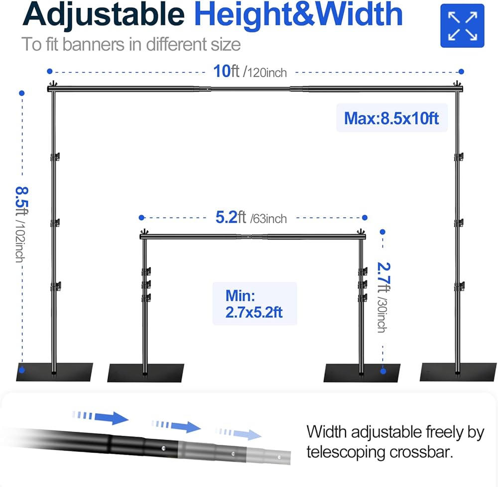 【Retractable Crossbar】 The telescopic design is adopted to make the width of the cross bar freely adjustable. The minimum width is 63inch/5.3ft, and the maximum width is 120inch/10ft. It can adapt to backdrops of different sizes. Refer to the product manual for specific dimensions and installation.