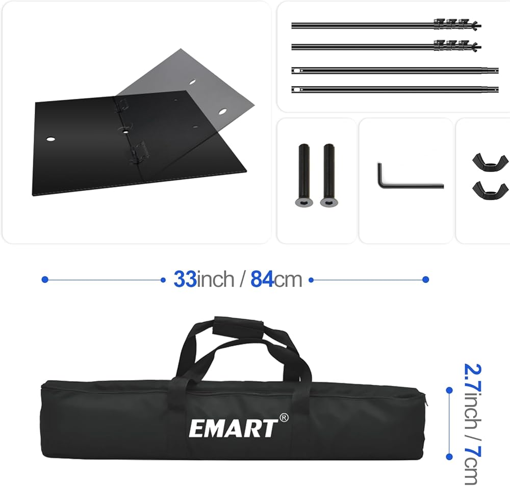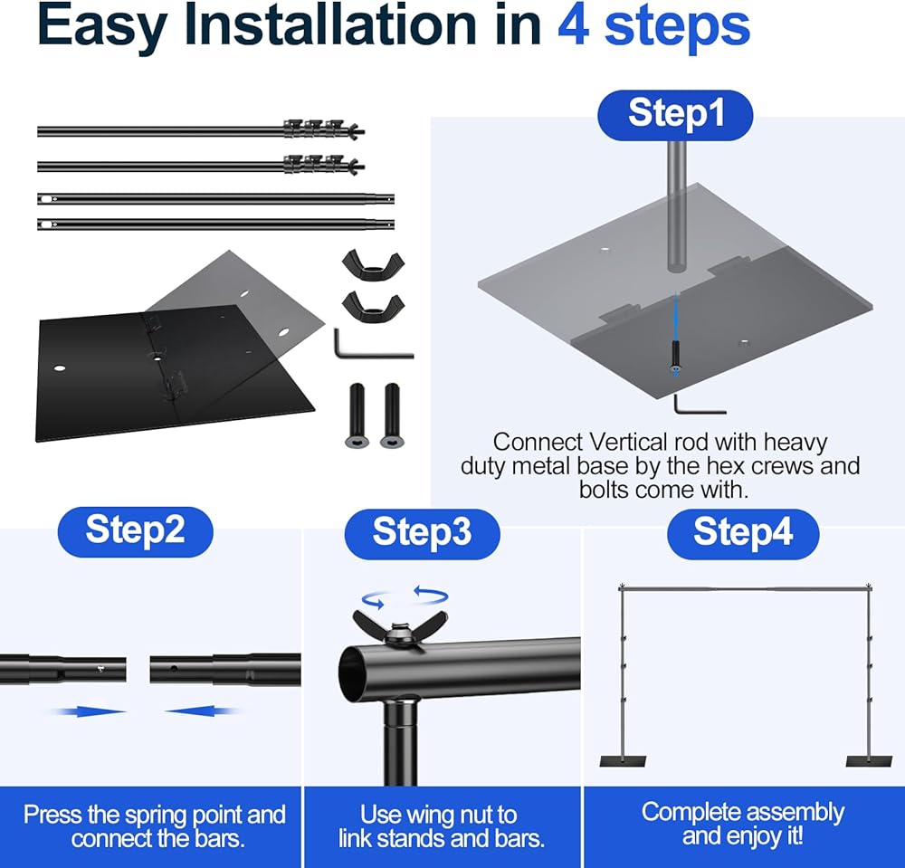 【Convenient Assembly】 The metal background support stand is easy to install and can be quickly assembled in a few minutes. Before installing, refer to the instruction manual or installation video on the product page to learn how to complete the installation correctly and quickly.