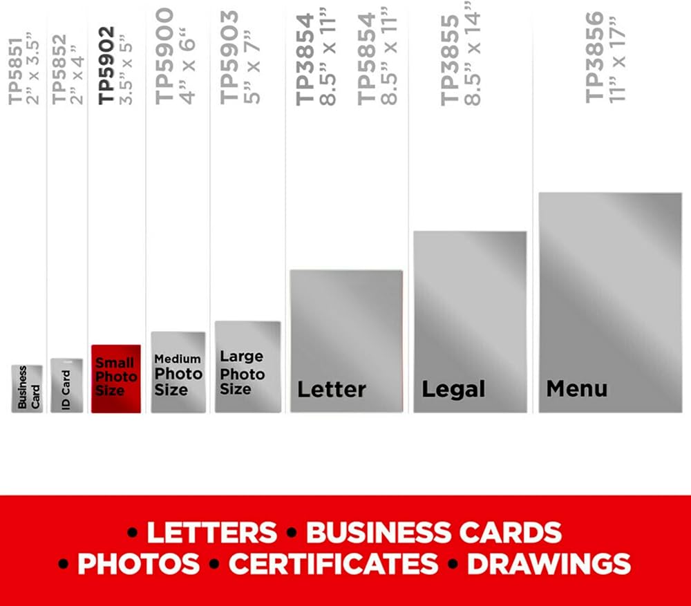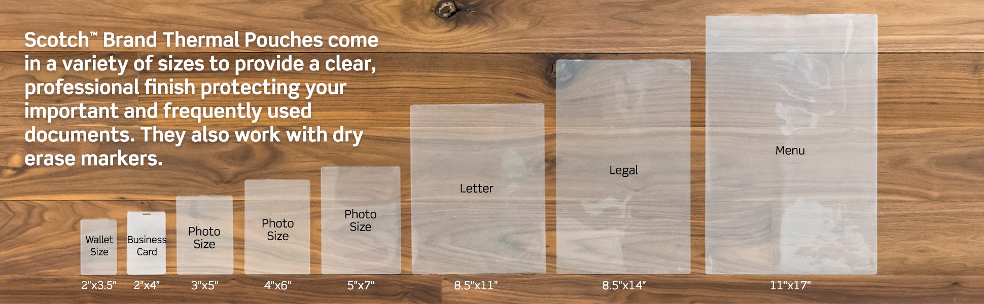 تم تصميم أكياس التغليف للاستخدام مع جهاز تغليف حراري 3M Scotch أو أي جهاز تغليف حراري قياسي. توفر الحقائب حماية فورية على الوجهين للمستندات والصور التي يتم التعامل معها بشكل متكرر.