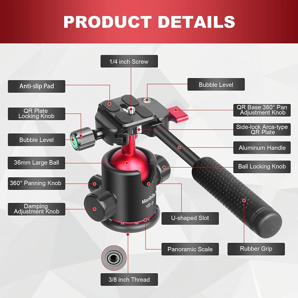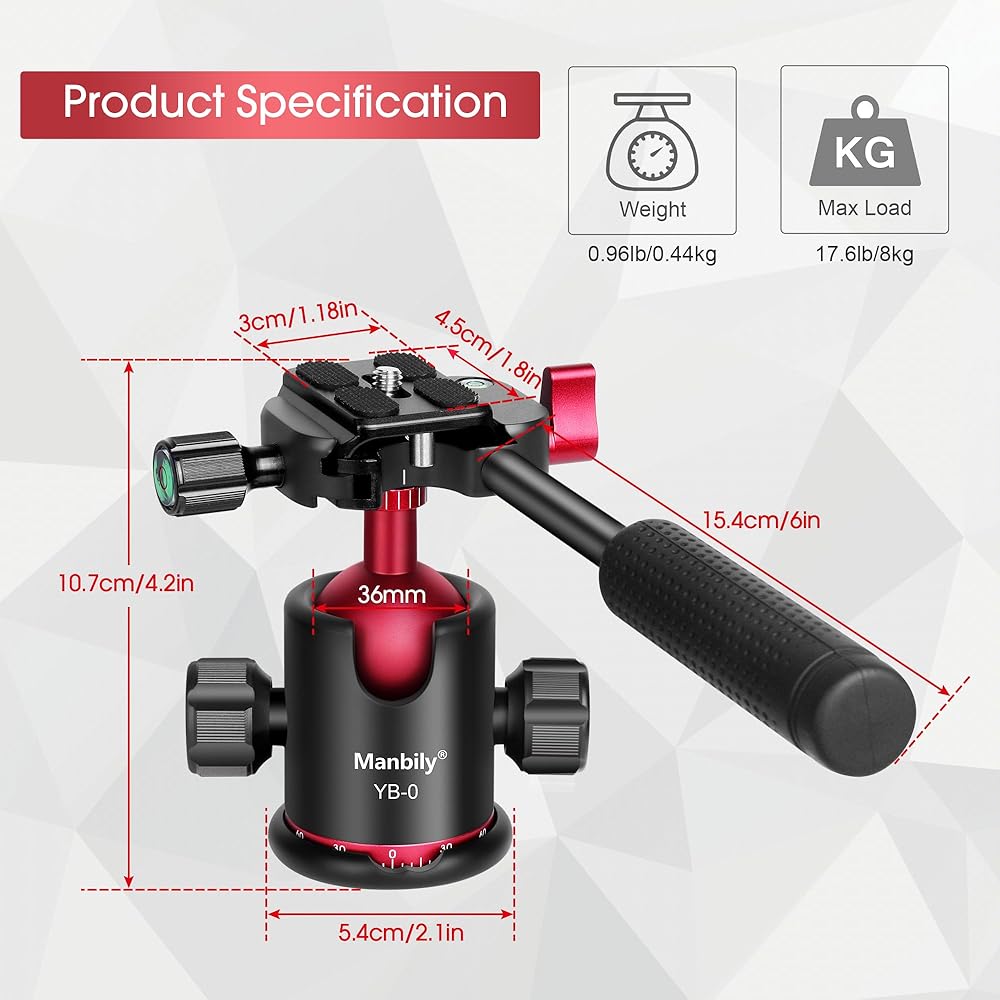🎥[High Stability Metal Ball Head] : This Manbily YB-0 ball head is made of high-quality aluminum alloy with a solid construction and a smooth anodized appearance that is safe and lightweight. The 36mm ball of the CNC process provides stable support. Max Load: 17.63lbs/8kg, Ball Head Height: 107mm, Base Diameter: 54mm, Item Weight: 0.96lb/0.44kg.