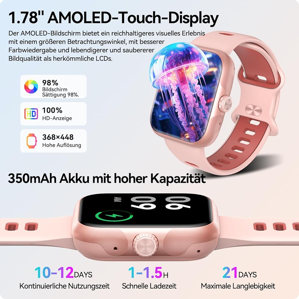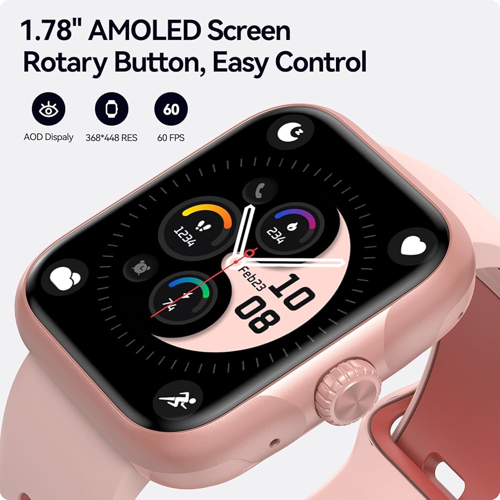 1.78'' AMOLED Customizable Display Smart watch:This Smartwatch Ultra boats a 1.78'' AMOLED display with 368*448 RES and 60 FPS refresh,providing an excellent visual experience. With a upgraded optical crown and advanced monitor, it brings you not only focuses on your health, but also provides convenient control and more multi-faceted data for you to fully understand yourself.