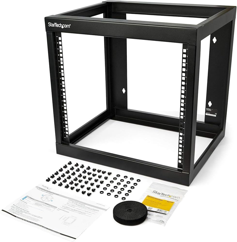 الأجهزة المتضمنة: يشتمل رف الخادم المثبت على الحائط ذو الإطار المفتوح على مجموعة كاملة من صواميل القفص المربعة M6، ومسامير M6، وخطاف وحلقة لتركيب جميع معداتك بشكل آمن في الرف