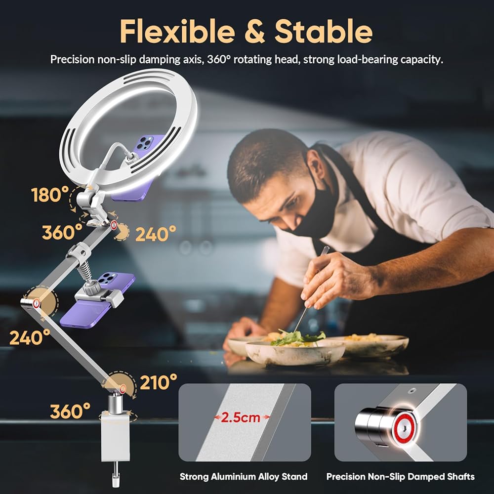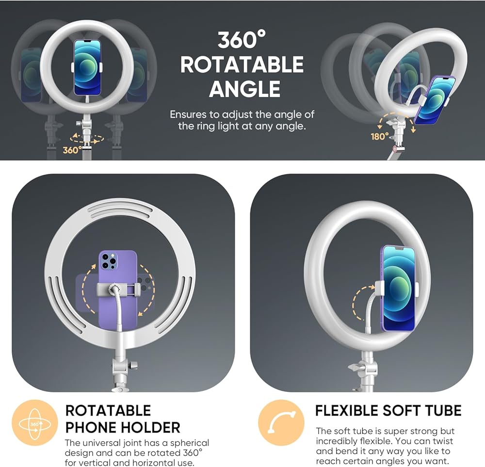 【حامل مرن وتركيب جهاز مزدوج】: حامل ثلاثي القوائم ذو الضوء الدائري الخاص بنا مصنوع من سبائك الألومنيوم، مع ذراع متأرجح مفصلي مريح، ويمكنه حمل 3 كجم من الجهاز. رأس ثابت قابل للدوران 360 درجة ورأس قابل للطي 180 درجة، مما يجعل من السهل التعامل مع أي زاوية تصوير. ضوء حلقة LED مع حاملي هاتف خلوي للاستخدام المتزامن، قم بتركيب جهازين بشكل آمن على حامل الضوء الدائري وداخل دائرة الضوء الحلقي. الراحة في أفضل حالاتها، الحل الأمثل لمتاعب عدم القدرة على تثبيت جهازين.