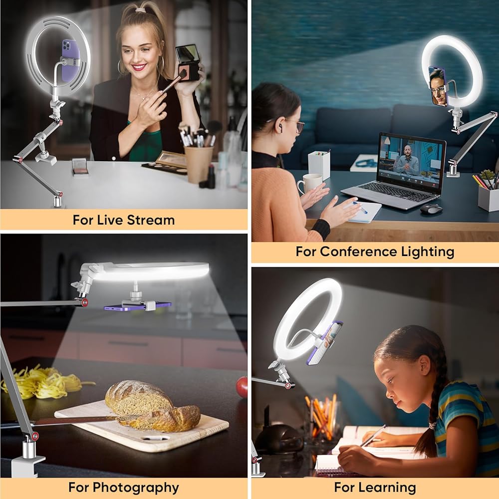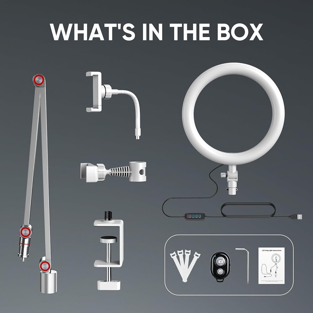 مصباح حلقة APEXEL مع حامل وحامل هاتف، ضوء حلقة USB 10 بوصة للمكتب مع مصراع عن بعد، حامل هاتف علوي مع ذراع قابل للتعديل ومشبك C للبث المباشر/التصوير الفوتوغرافي/المكياج/TikTok