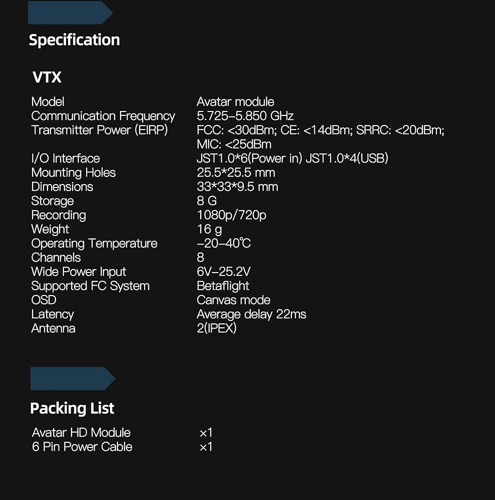 في الصندوق: وحدة 1x Avatar HD VTX 1x كابل الطاقة 6 دبوس