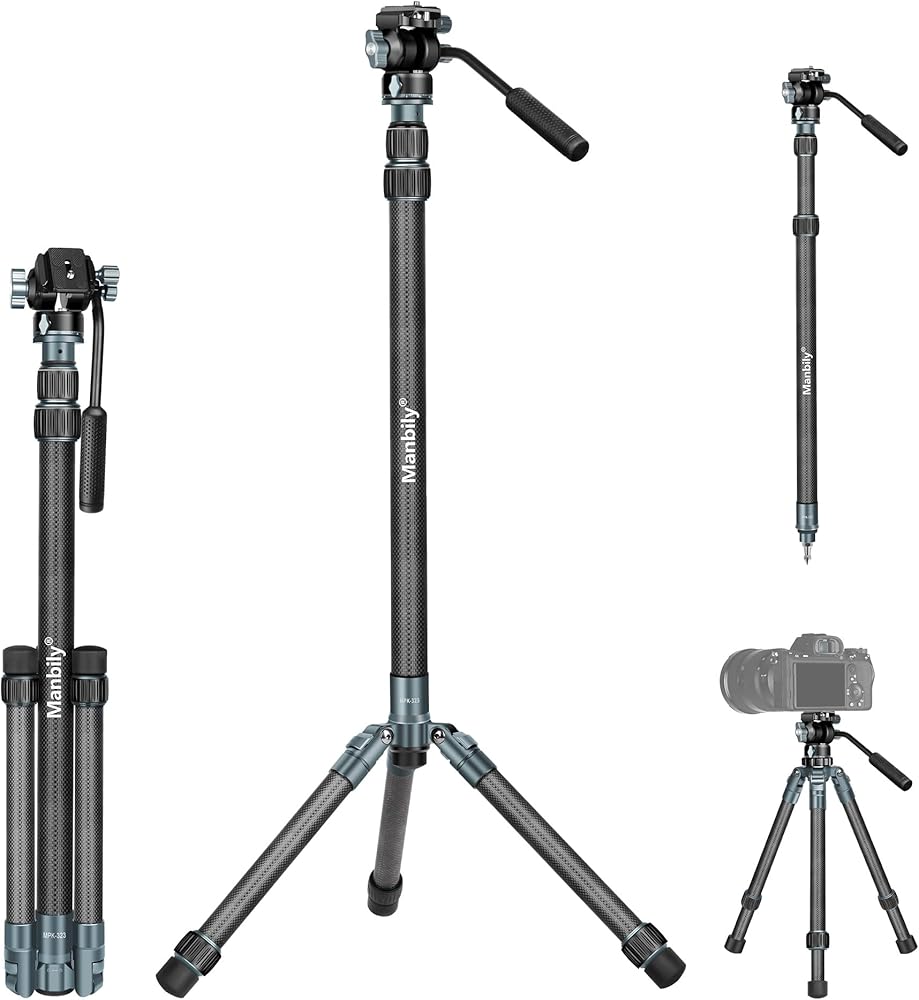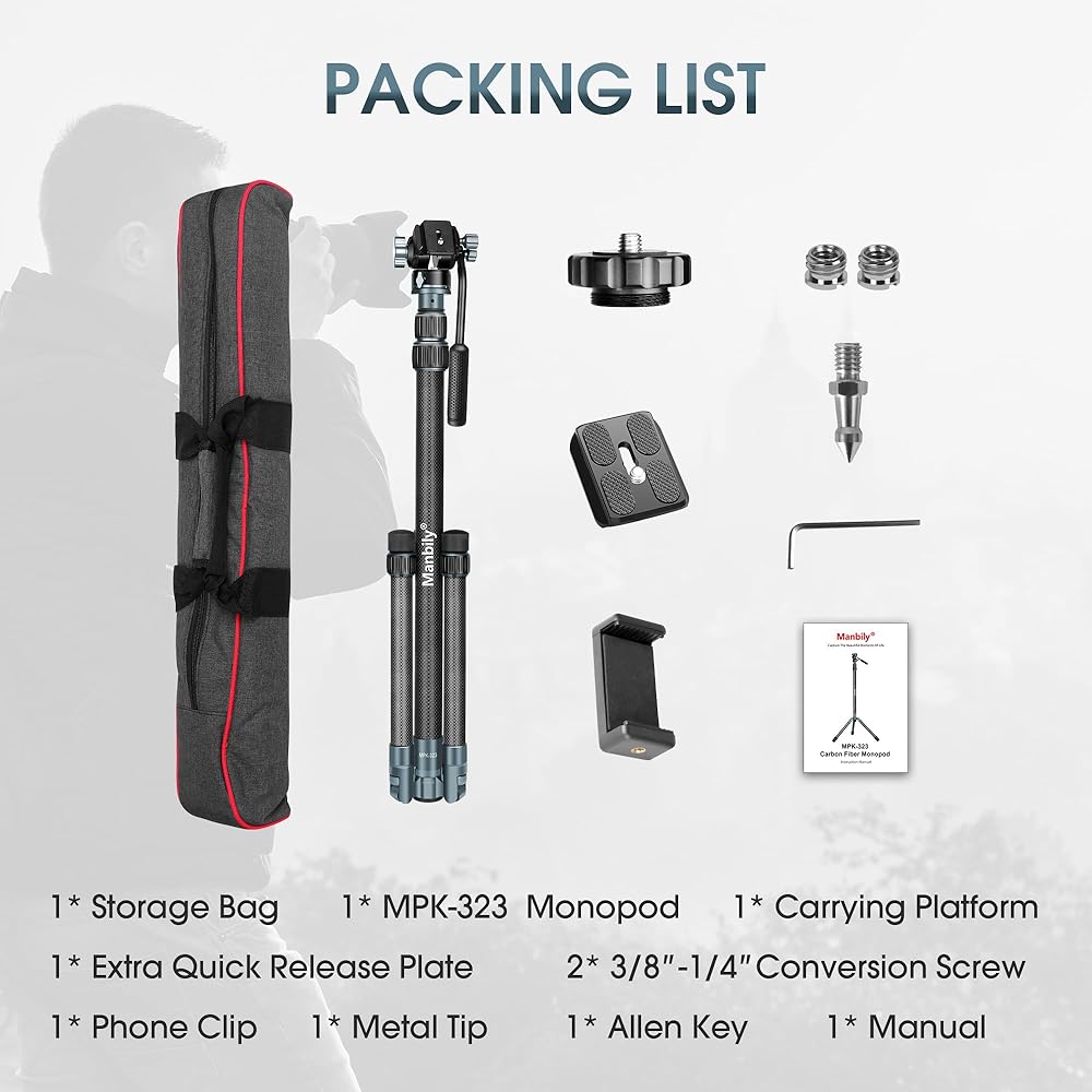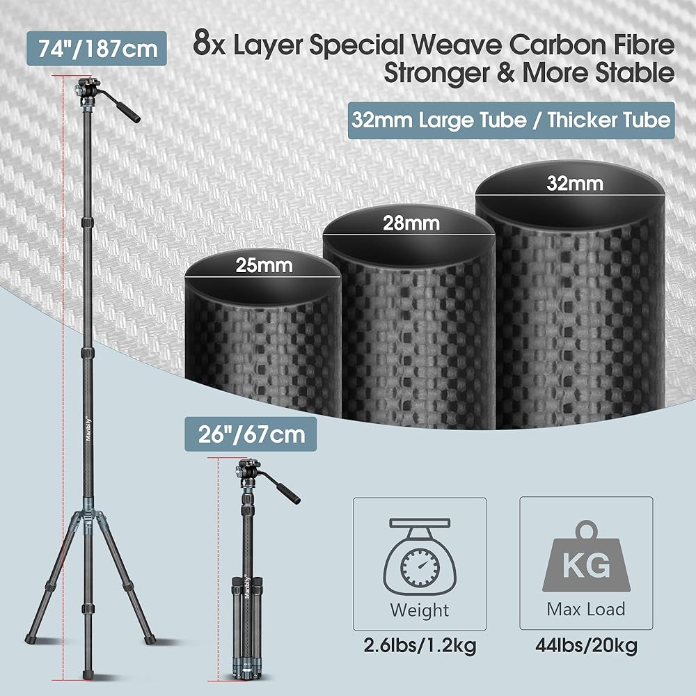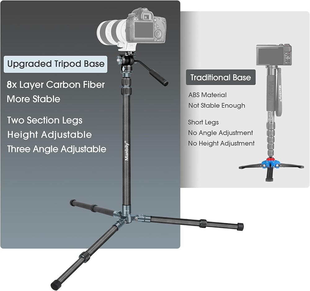Manbily MPK-323 مونوبود كاميرا من ألياف الكربون مع أقدام، مونوبود احترافي 74 بوصة مع رأس سائل مائل وقاعدة حامل ثلاثي قابلة للإزالة لكاميرا DSLR، أنبوب Φ32 مم، أقصى حمل 44 رطل/20 كجم