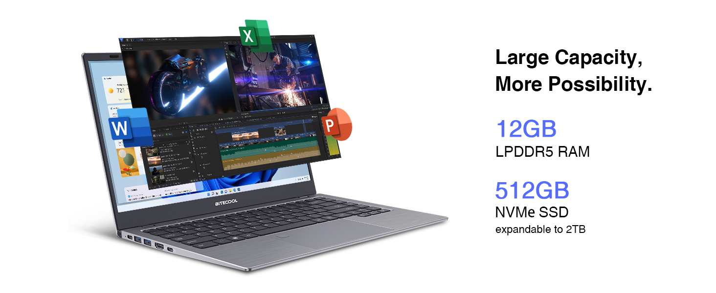 سعة تخزين كبيرة: مع مساحة تخزين كبيرة تبلغ 512 جيجابايت NVMe SSD، يمكنك تخزين جميع ملفاتك ومستنداتك المهمة دون القلق بشأن نفاد المساحة.