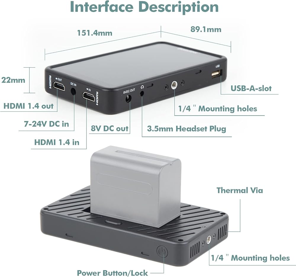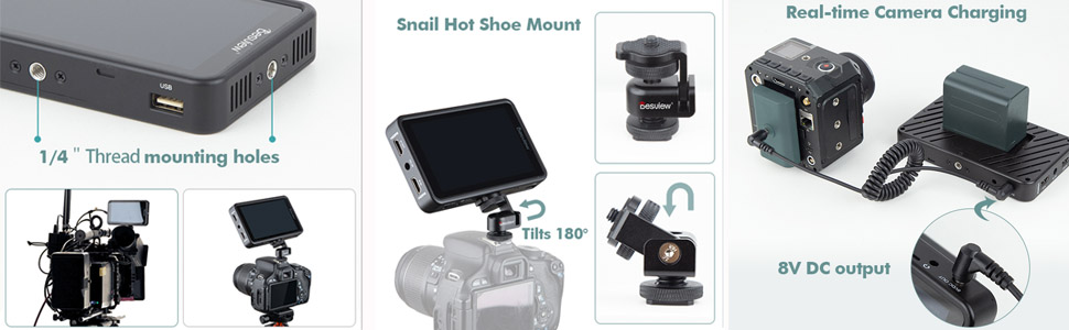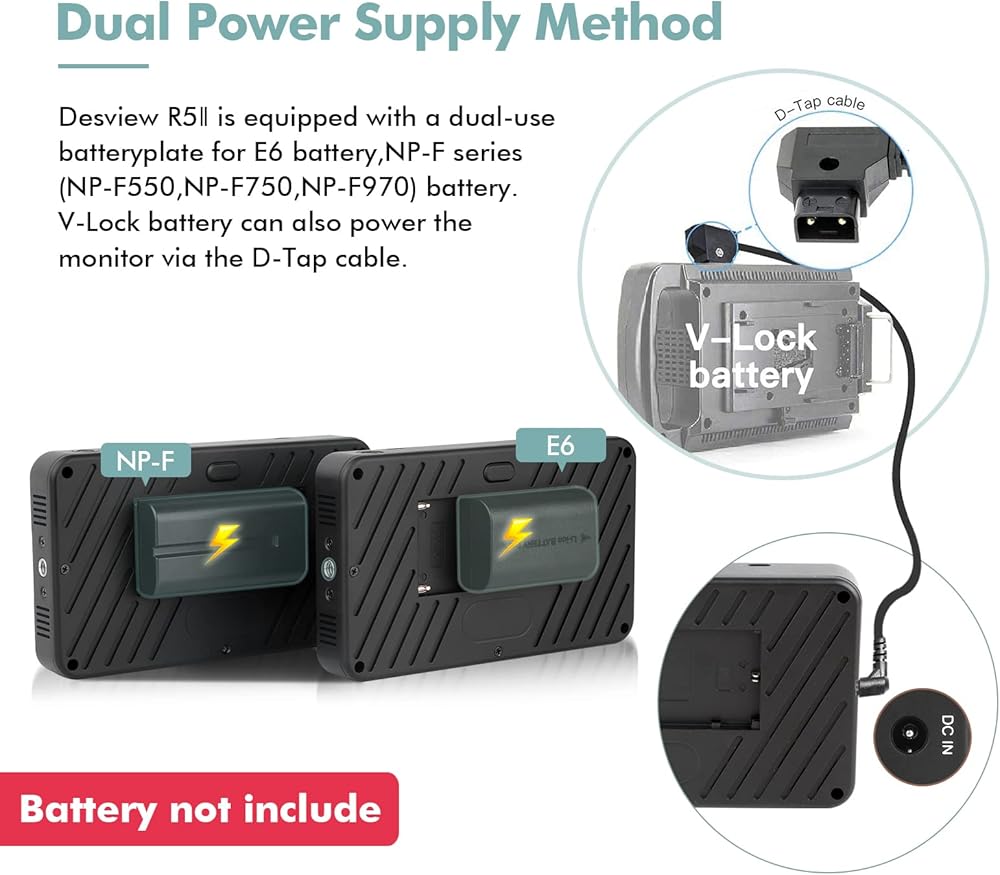 【مزود طاقة مزدوج】تم تجهيز ديسفيو R5ll بلوحة بطارية مزدوجة الاستخدام لبطارية E6، سلسلة NP-F (NP-F550، NP-F750، Np-F970) بطارية V-lock يمكنها أيضًا تشغيل الشاشة عبر كابل دي تاب.