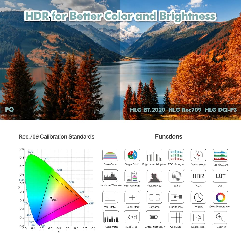【ميزات المساعدة الاحترافية】تم تجهيز المزيد من وظائف الشاشة لتحسين التصوير، مثل شكل موجة الشاشة الكاملة/الرسم البياني/فيكتورسكوب/اللون الزائف/الحمار الوحشي/التكبير/مساعدة التركيز الذروة/لون واحد/منطقة آمنة وما إلى ذلك، مما يساعد بشكل أفضل في التعرض والتركيز والتركيب.
