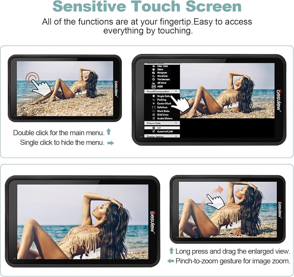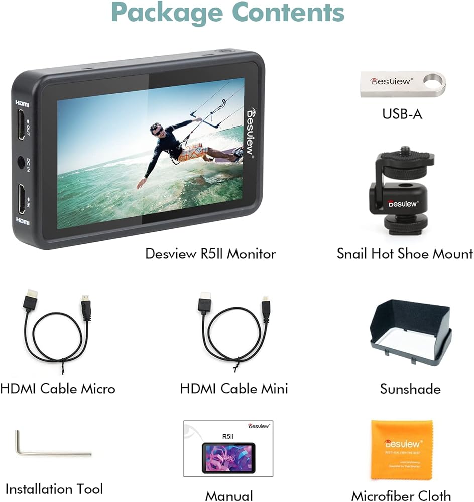 ديسفيو شاشة كاميرا R5II 5.5 انش 1920 × 1080 IPS تعمل باللمس بالكامل 4K HDMI HDR ثلاثية الابعاد LUT على الكاميرا مع حامل هوت شو ومظلة شمسية لكاميرا كانون وسوني وباناسونيك DSLR BMPPC 4K