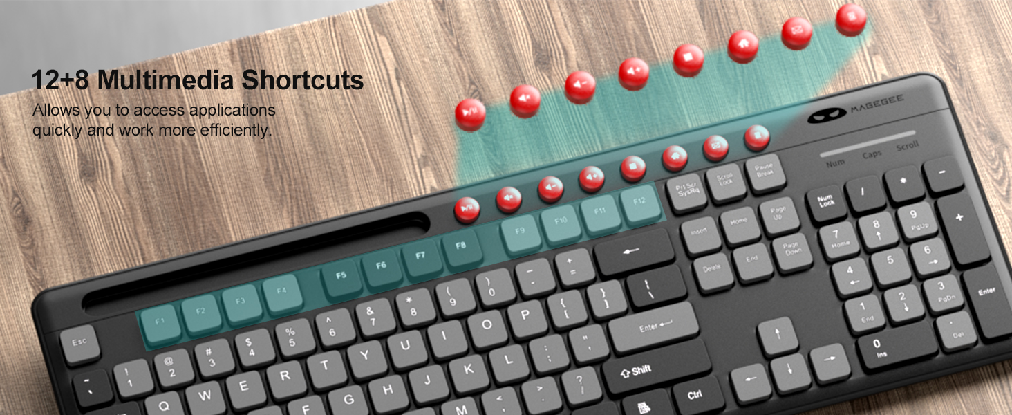 مجموعة لوحة مفاتيح وماوس لاسلكية، لوحة مفاتيح لاسلكية صامتة كاملة الحجم MageGee 2.4G مع حامل هاتف و8 اختصارات مستقلة، ماوس لاسلكي 3 DPI قابل للتعديل وخالي من التأخر للكمبيوتر/الكمبيوتر المحمول/الكمبيوتر الشخصي