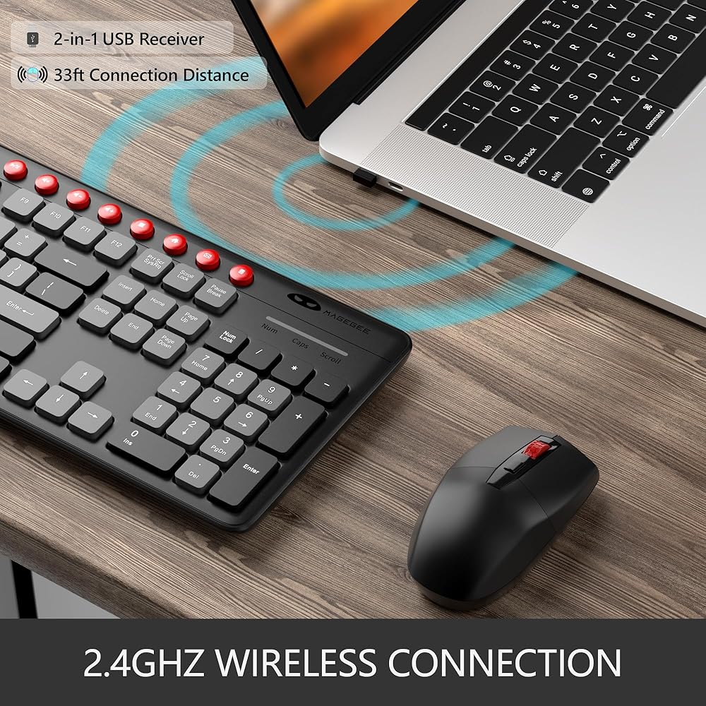 • لا يوجد اتصال متأخر، التوصيل والتشغيل: تشترك لوحة المفاتيح والفأر في مستقبل USB واحد 2.4 جيجا بايت، ما عليك سوى توصيل المستقبل (المخزن في الجزء السفلي من الماوس) بجهاز الكمبيوتر الخاص بك وستكون جاهزًا للانطلاق. يصل نطاق الاتصال إلى 33 قدمًا/10 أمتار بدون انقطاع.