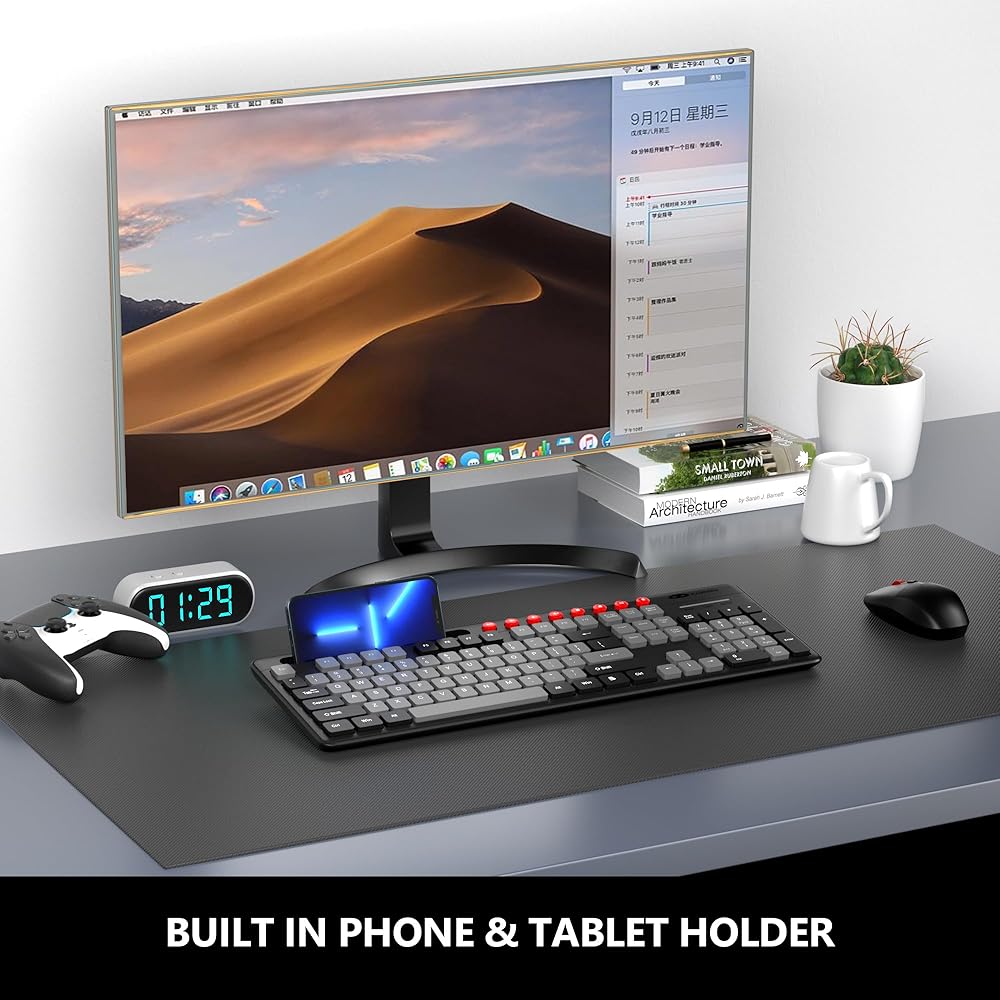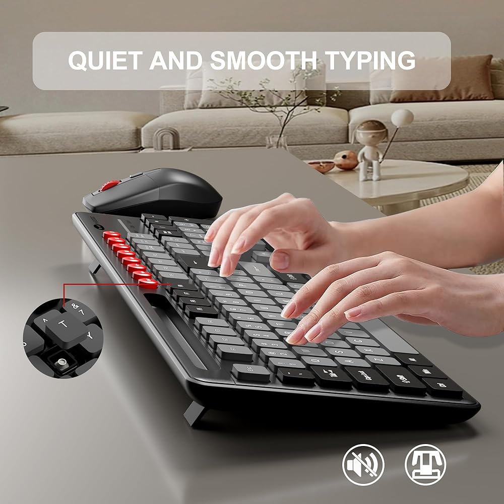 • لوحة مفاتيح وفأرة صامتة: تحتوي لوحة المفاتيح اللاسلكية هذه على هيكل غشاء بدون ضوضاء ولمسة مفاتيح جيدة. كل ضغطة مفتاح سلسة وحساسة، مما يمنحك تجربة كتابة ناعمة. لا يصدر الماوس صوت نقر ولن يزعج راحة الآخرين.