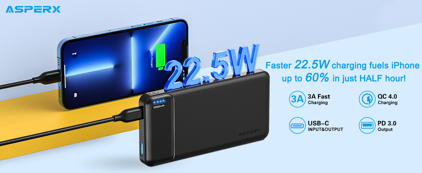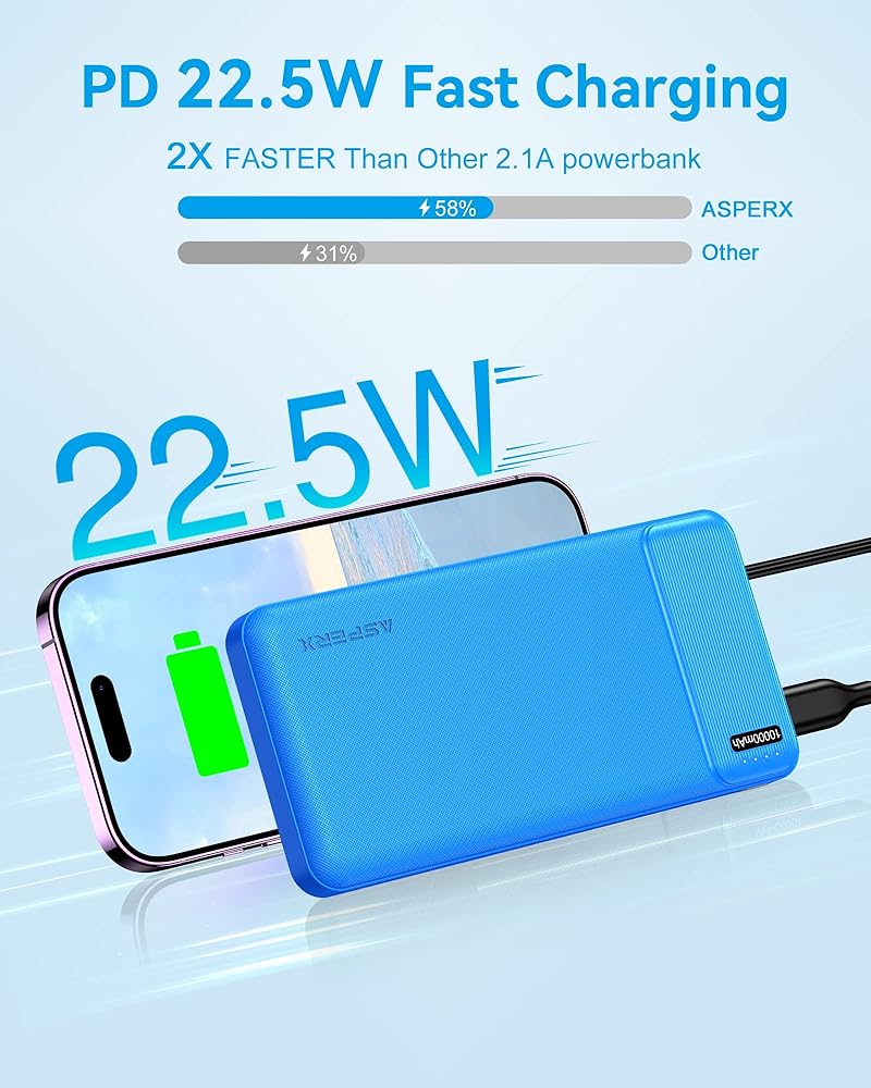 ✅(شحن سريع 22.5 واط) مع مخرج 22.5 واط بالإضافة إلى تقنيات الشحن السريع PD3.0 وQC4.0 الأكثر تقدمًا، يمكن لشاحن الطاقة المحمول AsperX 22.5 واط شحن هاتفك بسرعة لا تصدق من 0 إلى 58% في 30 دقيقة، أسرع مرتين من أجهزة الشحن التقليدية بقوة 2.4 أمبير.