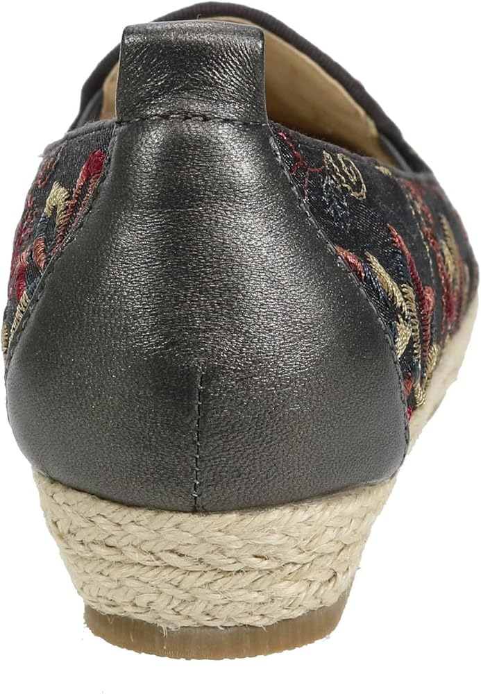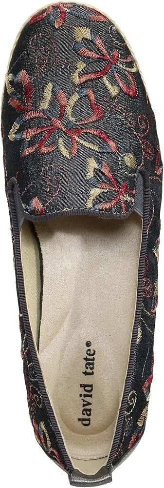 An allover embroidered detailing offers a sleek look to the David Tate Kindle Wedge Heels. Fabric upper. Tricot lining. Grosgrain topline. Extra foam padded insole. Slip-on style. Synthetic footbed. Pull tab on the back for easy wear. Double stretch gore for extra fit. Round toe design. Rubber outsole.