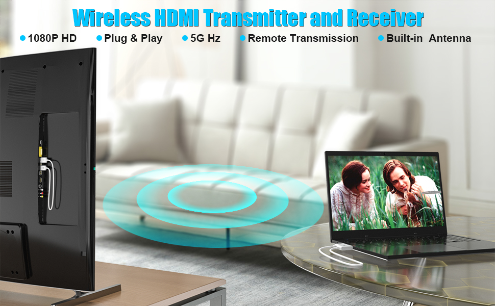 【جهاز إرسال واستقبال HDMI لاسلكي 5G 】يسمح لك جهاز إرسال واستقبال HDMI اللاسلكي هذا بتجربة نقل لاسلكي 5G سريع وموثوق، مما يوفر فيديو واضح بدقة 1080P@60 هرتز.