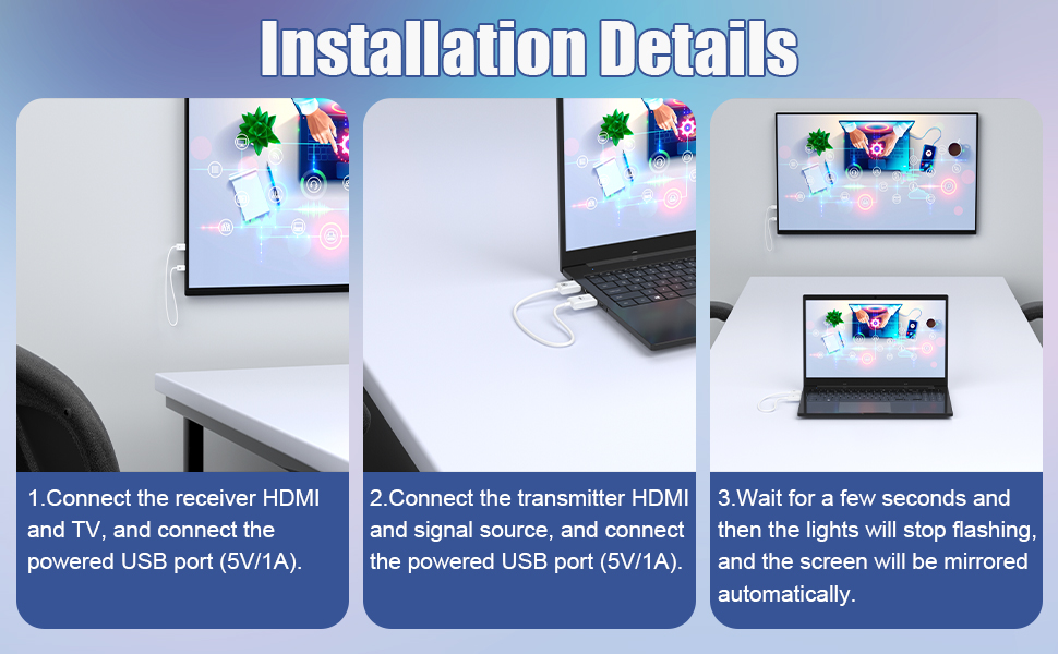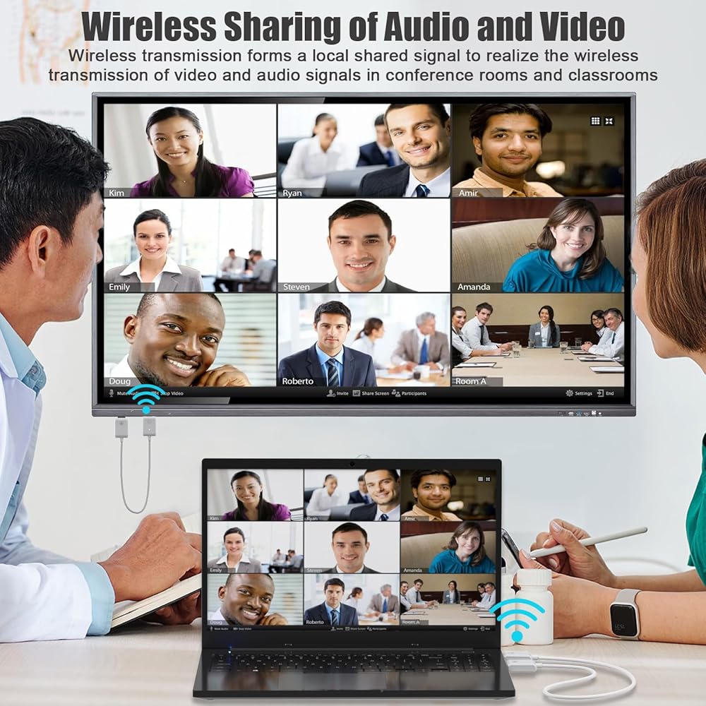 【محول HDMI لاسلكي】يدعم جهاز إرسال واستقبال HDMI اللاسلكي بث الفيديو اللاسلكي من شاشة صغيرة (كمبيوتر محمول/كمبيوتر شخصي) إلى جهاز شاشة كبيرة (تلفزيون/شاشة/جهاز عرض) مع مزامنة الصوت والفيديو (تأخير 60 مللي ثانية-80 مللي ثانية) . قل وداعًا لكابلات HDMI المتشابكة. مثالي لاجتماعات المكاتب والتعليم المدرسي ومؤتمرات الأعمال والمتاحف والفنادق ومراكز التسوق.