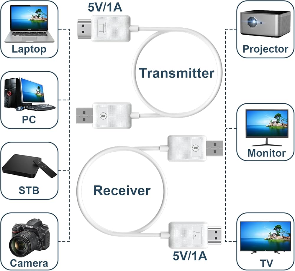 【موسع HDMI لاسلكي 98FT 】توفر مجموعة جهاز إرسال واستقبال الفيديو HDMI 1080P لدينا نقل HDMI لاسلكي لمسافات طويلة يصل إلى 98FT/30M. يمكنك البث بسهولة من خلال اتصال بسيط، بدون تطبيقات، بدون إعداد، بدون شبكة Wi-Fi، وبدون الحاجة إلى برامج تشغيل.