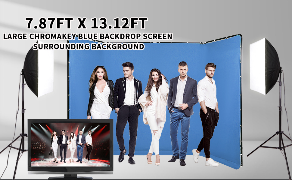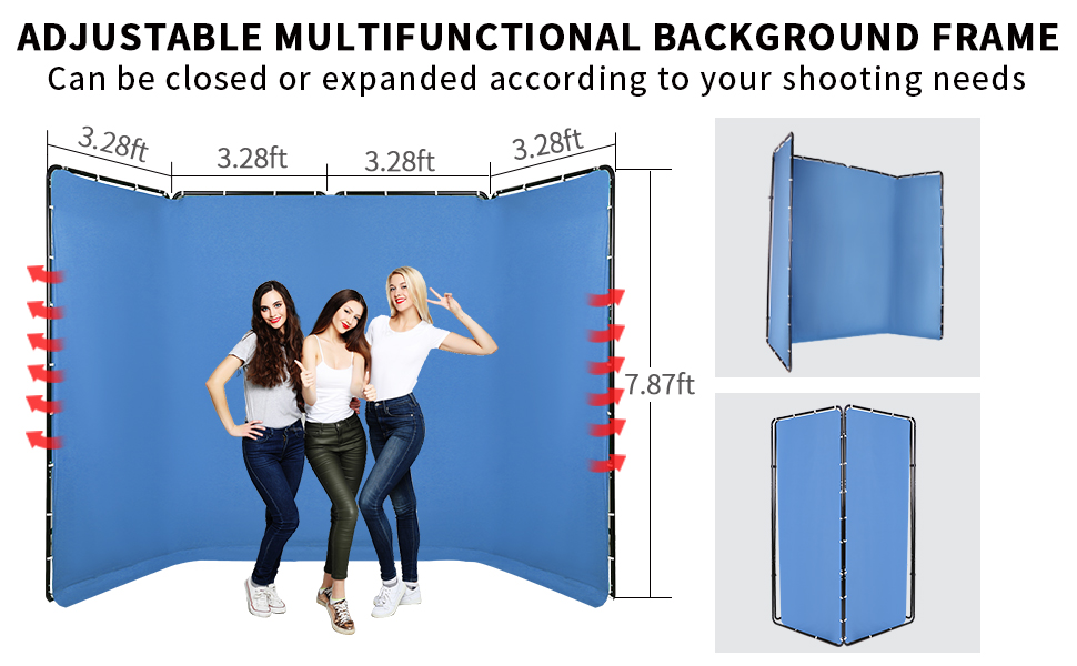 【Large Size Surrounding Background Stand】:The screen style background structure presents the surrounding background.7.87ft x 13.12ft large background size, can achieve multi person shooting.Larger use area, shooting without dead corners.