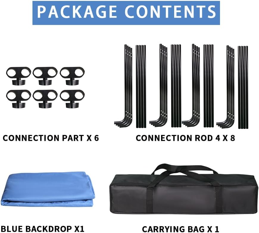 【Package & Warranty】Blue backdrop X1,Connecting partx6,Connection rod 4x 8,Carrying bag x1.WARRANTY:If you receive the product with any problem, please feel free to contact us. You will get the best and satisfied solution within 24 hours during working days.1 year warranty and friendly customer service.
