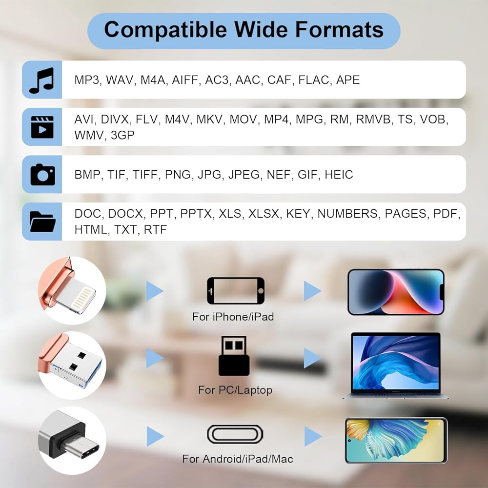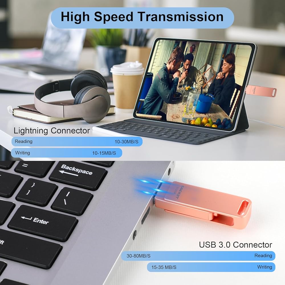 • توافق واسع: محرك أقراص فلاش USB 3.0 لهاتف iPhone مزود بمنفذ Lightning، النوع C، وUSB 3.0، الذي يدعم iPhone 13/12/11، 13/12/11 Pro، 13/12/11 Pro Max، 13/12 Mini ، SE، XR، XS، XS Max، X، 8 /7/6S/6 بلس، 8/7/6S/6، 6/5S، آيباد 5/6/7/8/9، ميني 2/3/4 /5/6 iPad Air-Serie وiPad Pro-Serie والكمبيوتر الشخصي وهواتف Android الأخرى التي تحتاج إلى وظيفة OTG.
