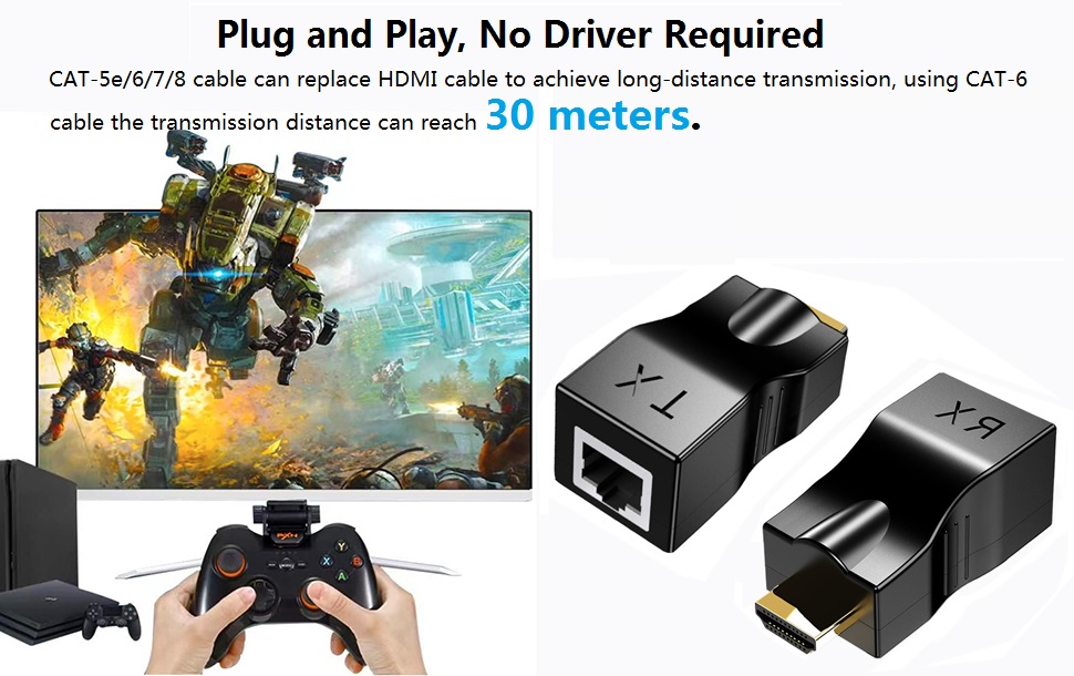 • 【الوظائف】يتكون موسع HDMI من جهاز إرسال (TX) وجهاز استقبال (RX)، وينقل إشارات HDMI من خلال كابلات كات 5/5e/6/7/8 حتى 30 متر. يجب استخدامه في أزواج، التوصيل والتشغيل، لا حاجة إلى إعداد/مصدر طاقة خارجي.